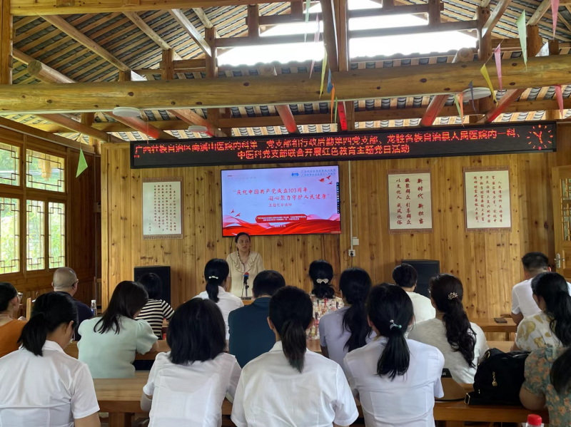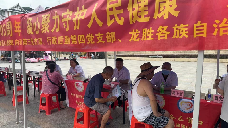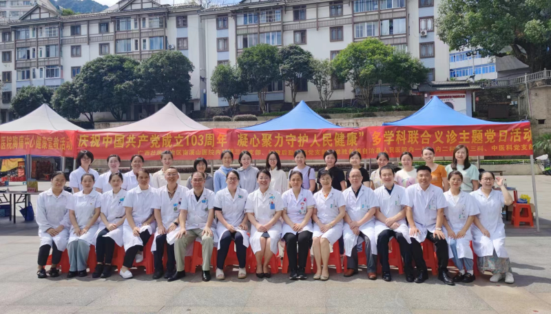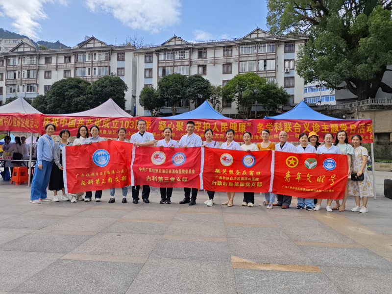 7月14日,广西壮族自治区南溪山医院多个党支部联合龙胜各族自治县人民医院开展了以“庆祝中国共产党成立103周年,凝心聚力守护人民健康”为主题的多学科联合义诊活动。用实际行动展现党员们的服务精神,体现了南溪山医院深厚的医德医风和对社会责任的坚定担当。
