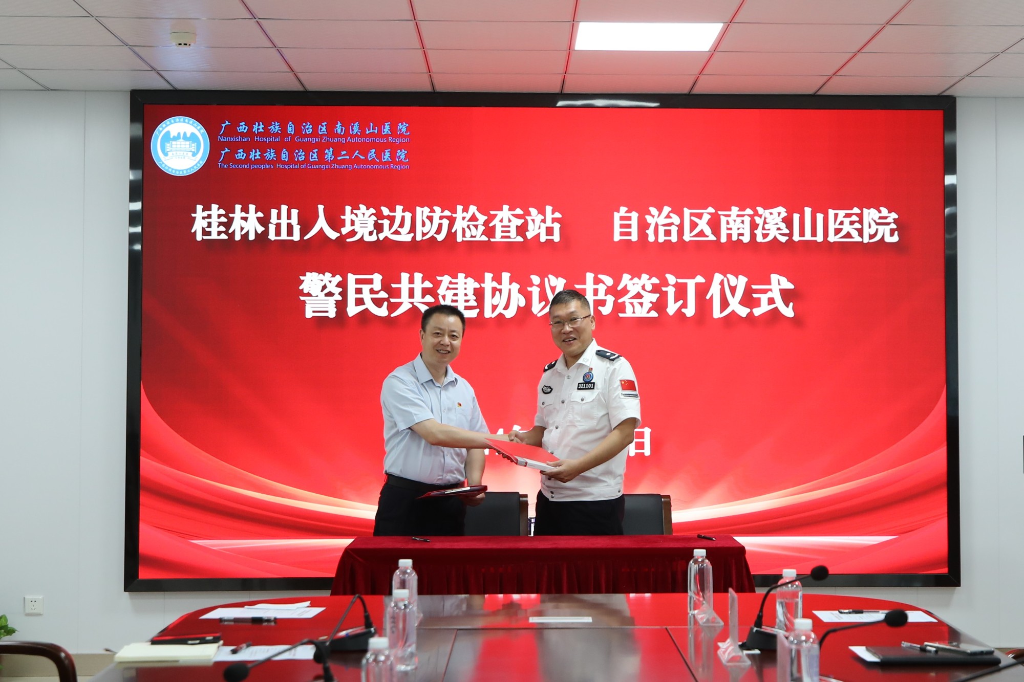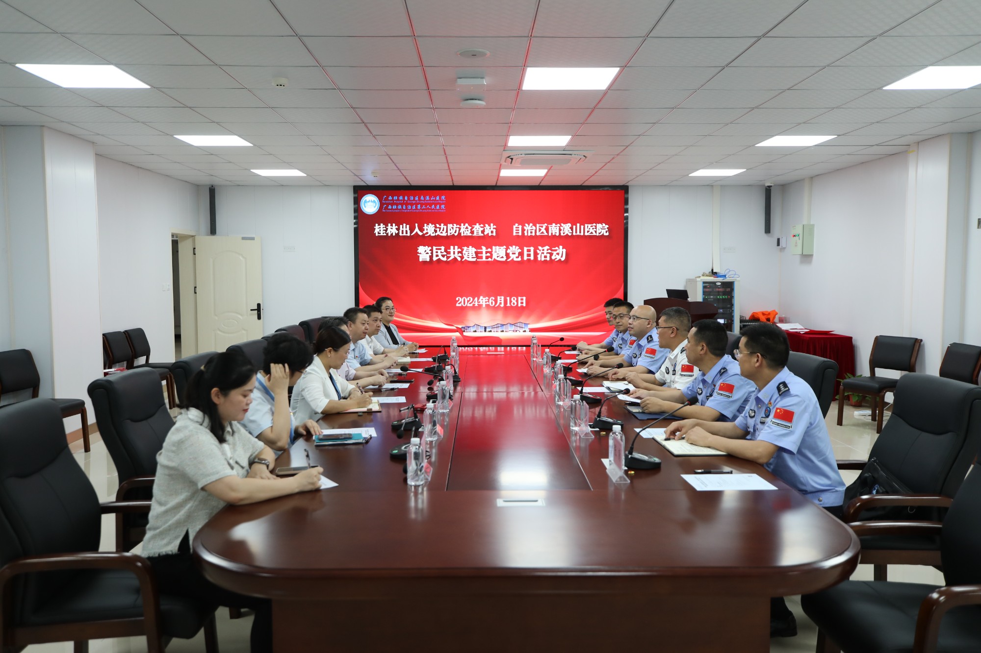 为持续深化警民合作,优化党建资源共享,6月18日下午,广西壮族自治区南溪山医院与中华人民共和国桂林出入境边防检查站(以下简称桂林出入境边防检查站)联合开展警民共建主题党日活动,并签订《警民共建协议书》。中华人民共和国桂林出入境边防检查站党委书记、站长王树东、党委副书记、政治委员甘华,党委委员、副站长董智锐,党委委员、后勤保障处处长张仁柱,四警高级警长、政治处副主任邓卫民以及相关警务人员与自治区南溪山医院党委书记柳宏林,党委副书记、院长李朝旭,党委委员、副院长唐芬及医院相关科室负责人参加会议。