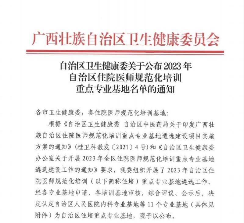 近日,广西卫生健康委公布了2023年自治区住院医师规范化培训重点专业基地名单,自治区南溪山医院内科专业基地名列其中,这是桂北地区唯一一家自治区级内科住培重点专业基地。