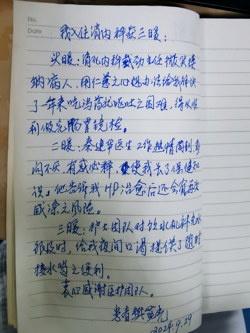 南溪山医院消化内科获赠患者暖心日记,彰显医患情深