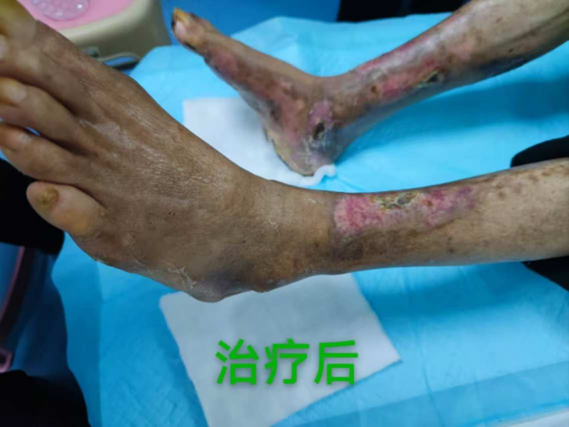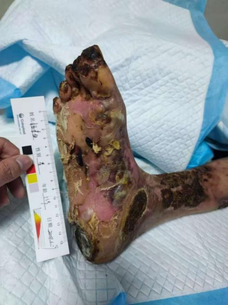 据了解,该患者因长期糖尿病未得到有效控制,年初烤火时不慎导致双下肢广泛性大疱,足跟、足底更是出现大面积糜烂和溃疡,疼痛难忍,行走困难。在辗转多家医院治疗效果不佳后,患者慕名来到自治区南溪山医院特需医疗病区。面对如此严重的病情,特需医疗病区科主任宾小昌凭借近20年的内分泌专业工作经验,迅速组织专家团队进行会诊,并制定了详细的治疗方案。科室开展的糖尿病足清创、正负压引流、骨水泥、自体富血小板凝胶等诊疗技术,在创手外科、营养科、烧伤与整形外科、中医科、药学部等多学科协作下,大大提高了糖尿病足的治愈率。