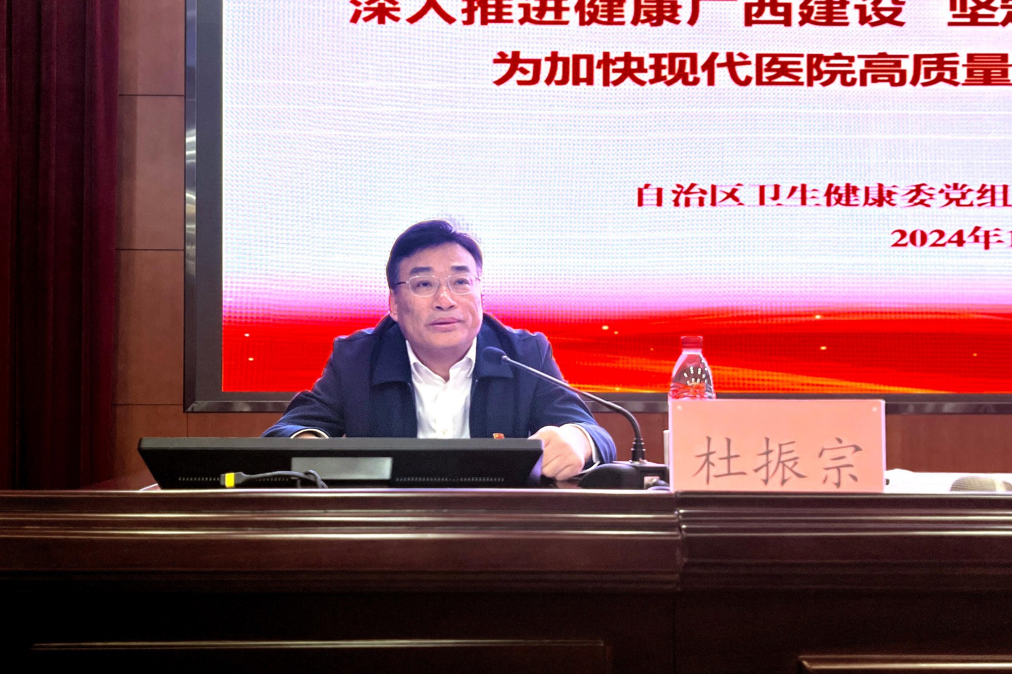 自治区卫生健康委党组书记、主任杜振宗在开班第一课上以《深入推进健康广西建设 坚定不移推进全面从严治党 为加快现代医院高质量发展奠定坚实基础》为题为学员们开启了专题授课,杜振宗同志围绕“深刻认识推进健康广西建设的重大意义”、“坚定不移推进全面从严治党”、“把全面从严治党成效转化成推进现代医院高质量发展的强大动力”三个方面进行深入浅出的授课。杜振宗同志指出,要深入贯彻落实习近平总书记关于卫生健康工作的重要论述和对广西重大方略要求,全面推进健康广西建设,深入开展爱国卫生工作,持续完善医疗卫生服务体系,加快推动国家公立医院改革与高质量发展示范项目,抓紧建设紧密型城市医疗集团试点。课上总结了健康广西主要工作的进展成效,一是全区新冠疫情防控取得决定性胜利,二是全区医疗卫生服务体系持续健全完善,三是持续提升医疗卫生服务质量水平,四是重大疾病防治重点人群健康得到有效保障,五是有效服务经济社会发展和“一带一路”倡议。杜振宗同志强调,医院要建章立制、堵塞漏洞,以医药领域腐败问题集中整治为重点深化全面从严治党,高效推进发展和安全,防范化解卫生健康领域重大风险,统筹卫生健康事业发展,深入推进健康广西建设,坚持“人民至上”,提高医院发展“含金量”,把全面从严治党成效转化成推进现代医院高质量发展的强大动力。