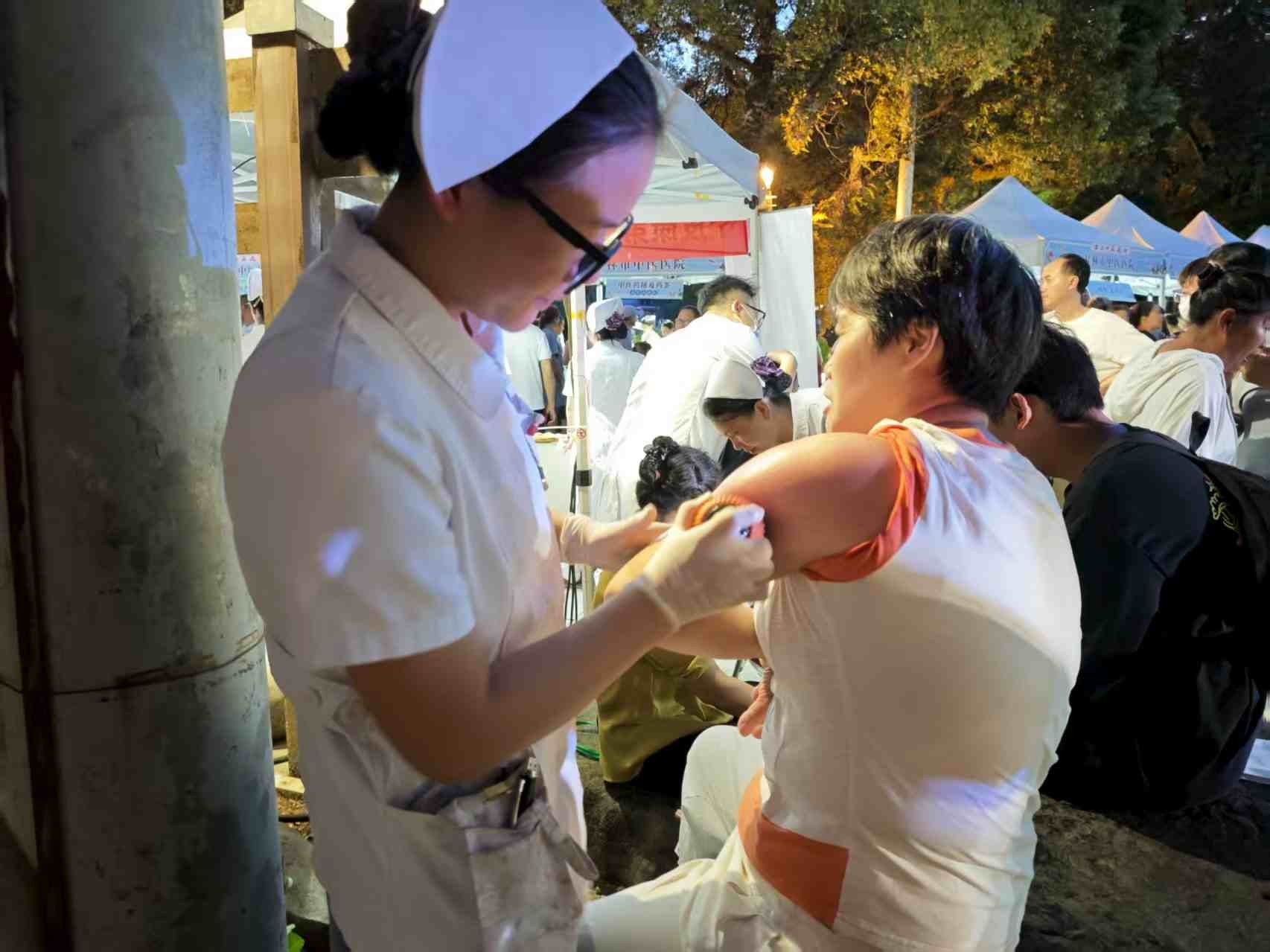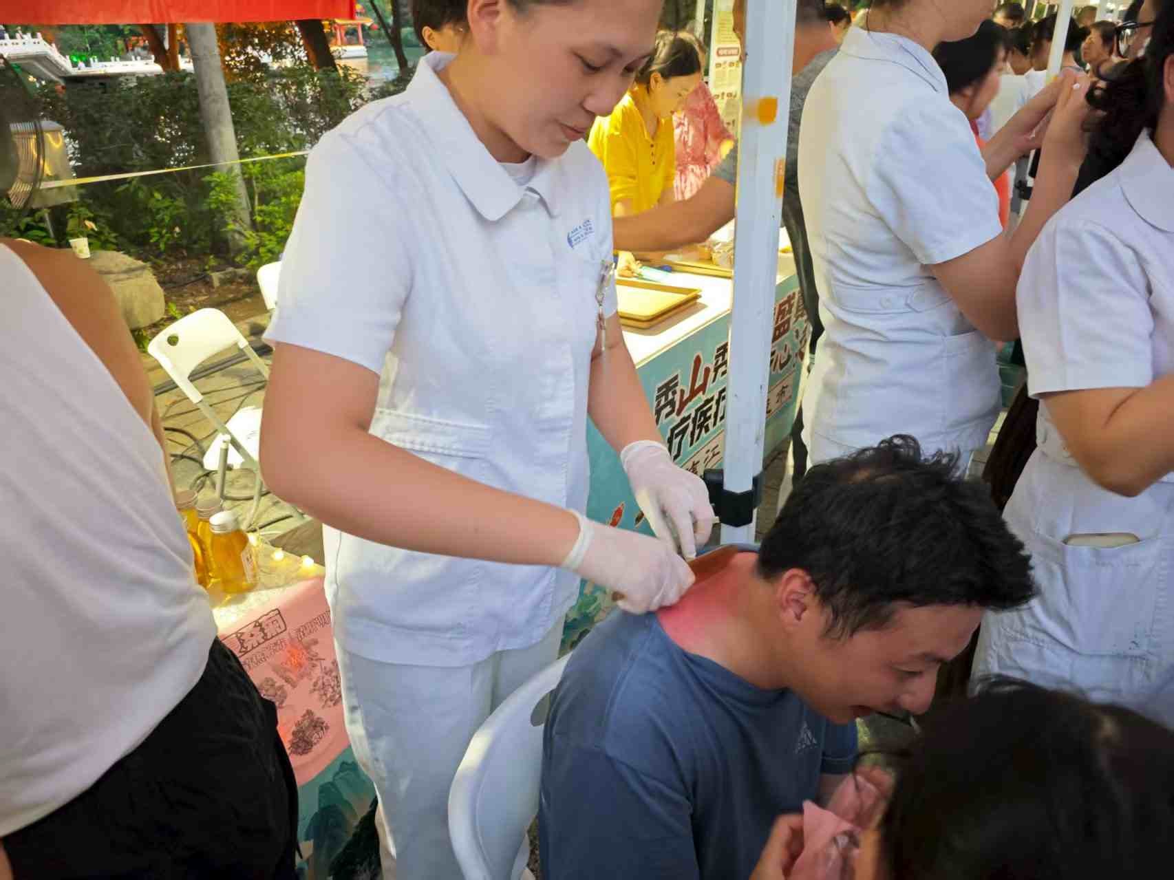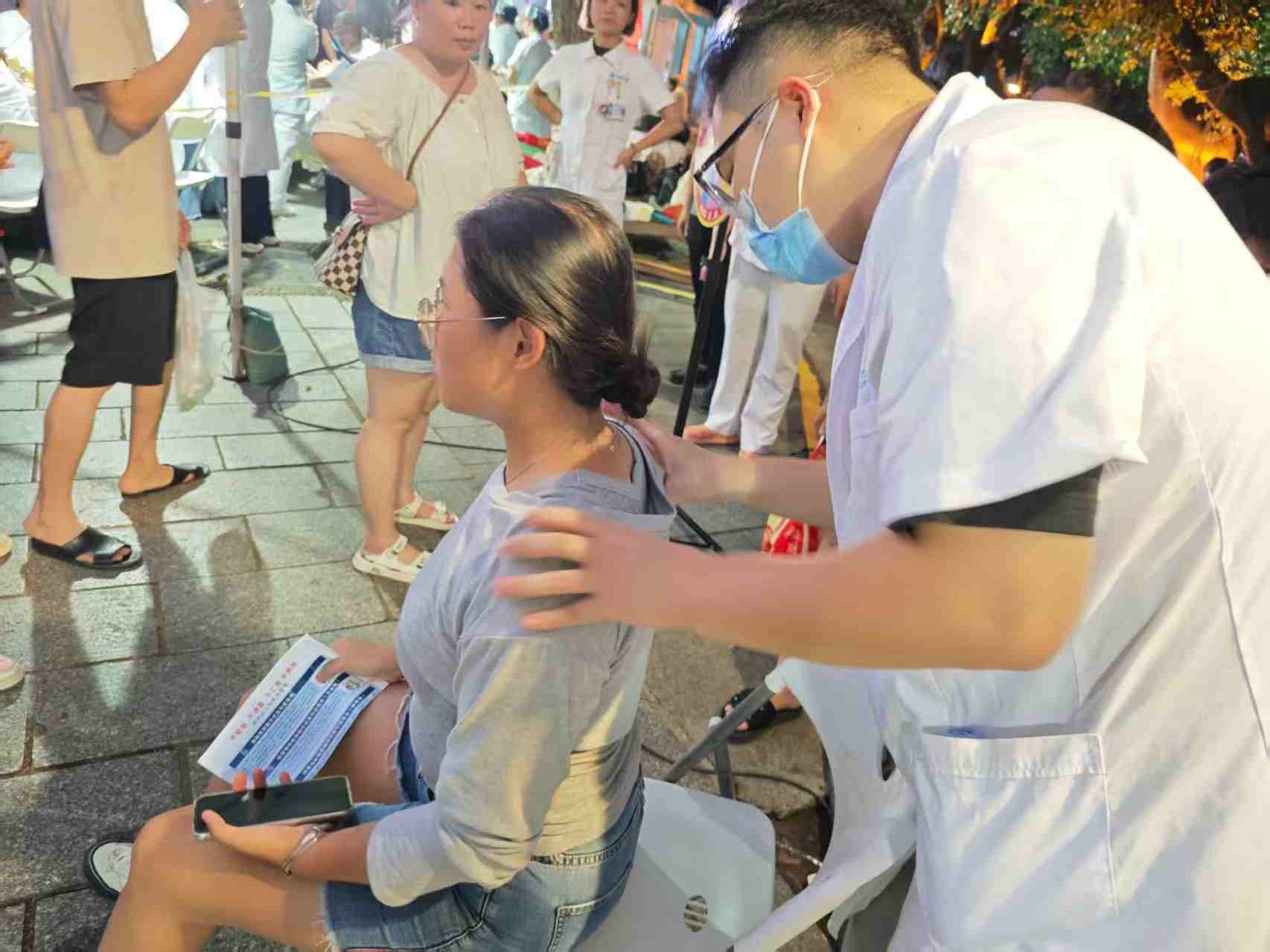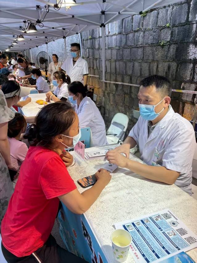 活动现场,古南门夜市灯火璀璨,人流络绎不绝。中医科医护人员提前布置好义诊摊位,备好诊疗器具,为市民提供包括中医问诊、体质辨识、中医养生健康指导等多项服务。面对市民关于颈肩腰腿痛调理、亚健康改善、四季养生等问题,在中医科阳绍华主任的带领下,医护人员结合中医理论详细解答,针对性给出针灸、推拿、火龙罐、耳穴压豆等特色疗法的建议,让市民近距离感受中医 “治未病” 的理念与优势。“平时总觉得肩膀发紧,刚才体验了火龙罐,感觉整个后背都舒展了,中医的这些疗法真的很实用。” 一位参与活动的市民说道。现场,不少市民在了解自身状况后,亲身体验了适合的中医特色治疗项目,直观感受到传统医学的疗效。