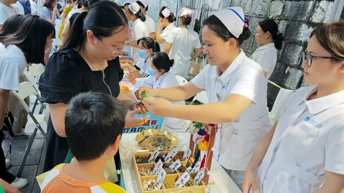 猜中药灯谜区人气十足,“归来” 对应 “当归”、“家乡” 暗合 “熟地” 等巧思谜题,让市民在竞猜互动中轻松记住中药的名称与功效;中药茶饮台前,医护们结合季节特点推荐的菊花茶、酸梅汤等养生饮品,市民细细品味间,便读懂了中药调理的智慧;DIY 中药香囊区域更是热闹非凡,大家在医护指导下熟悉药材,亲手调配比例、系合囊袋,一个个散发着草木清香的香囊,既是实用的养生好物,更是承载中医文化的移动宣传员。