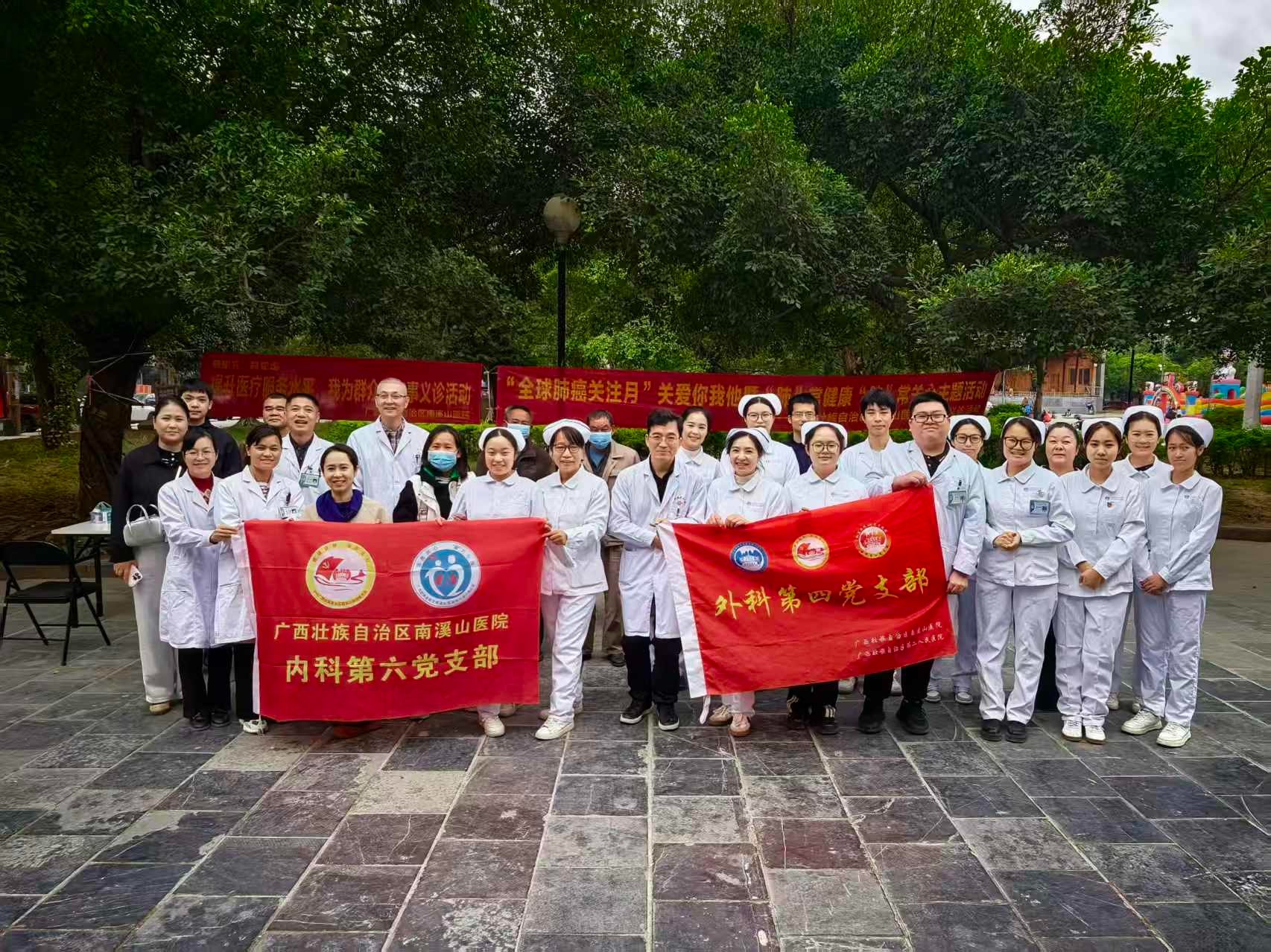 为积极响应"全球肺癌关注月"号召,进一步普及肿瘤防治知识,倡导健康生活方式,近日,广西壮族自治区南溪山医院外科第四党支部联合内科第六党支部在灵川大圩镇开展了主题为"关爱你我他,‘肺’常健康,‘肺’常关心"的义诊活动。本次活动旨在通过健康宣教和义诊服务,帮助群众增强健康意识,降低肺癌等肿瘤疾病的风险因素,让科学的防治理念深入人心。