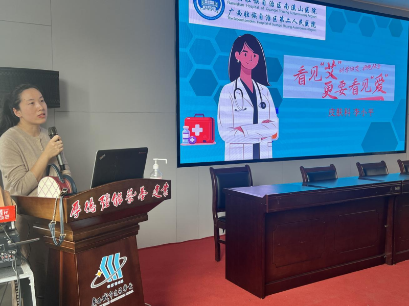 与此同时,皮肤科科教副主任李小平医生开展了《看见“艾”更要看见“爱”》健康知识科普讲座,200名学生前来参加,教室内座无虚席。李小平结合青少年心理特点,讲解了皮肤疾病预防、艾滋病预防相关知识,“同学们记住,看见‘艾’更要看见对生命的关爱。”李小平医生将防艾知识巧妙融入“皮肤密码破解”互动游戏,讲解常见皮肤病演变过程。学生在轻松的氛围中学习并掌握了科学防护技能。