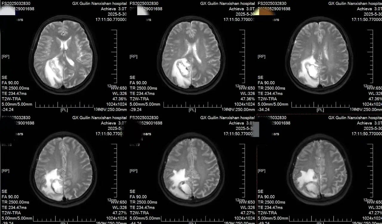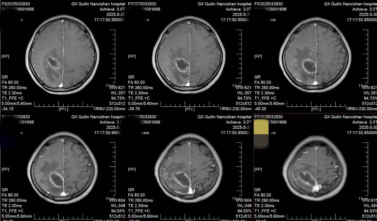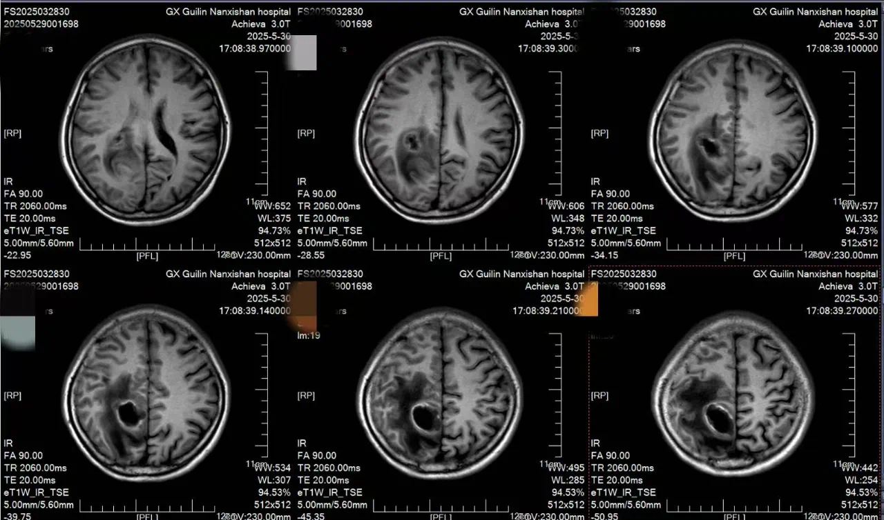 患者李女士自诉约2天前无明显诱因出现头痛,疼痛性质为阵发性胀痛,可自行缓解,伴有左侧肢体乏力,行走不稳。在本地医院检查后诊断:右侧顶叶占位性病变并周围脑组织水肿。为进一步治疗,来到南溪山医院就诊,完善各项检查后确诊为:功能区脑脓肿。