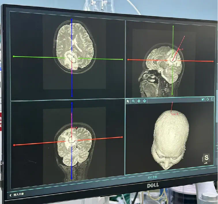 面对李女士的病情,神经外科团队经过反复讨论,决定采用机器人辅助实时可视化抽吸微创手术。手术前,团队通过3D影像重建技术,为李女士的脑部构建了精准的三维模型,清晰标注出脓肿的大小、形态以及与周围血管、神经的位置关系。手术机器人则根据这些数据,自动规划出最优穿刺路径,误差可控制在0.5毫米以内。