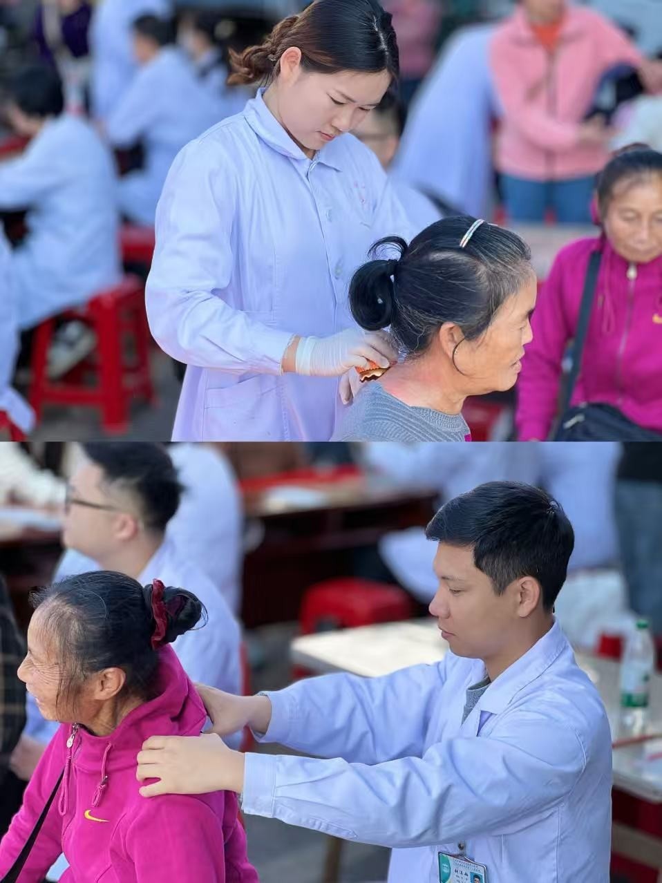 专家们针对农村常见的外伤后遗症、关节疼痛、腰肌劳损及皮肤疾病等问题,进行专业诊断与科学用药指导。中医科党员现场演示康复训练动作,传授居家自我保健方法;烧伤科专家详细讲解皮肤预防与护理知识,并发放健康宣传手册。党员志愿者们积极引导、答疑解惑,现场秩序井然、温情洋溢。