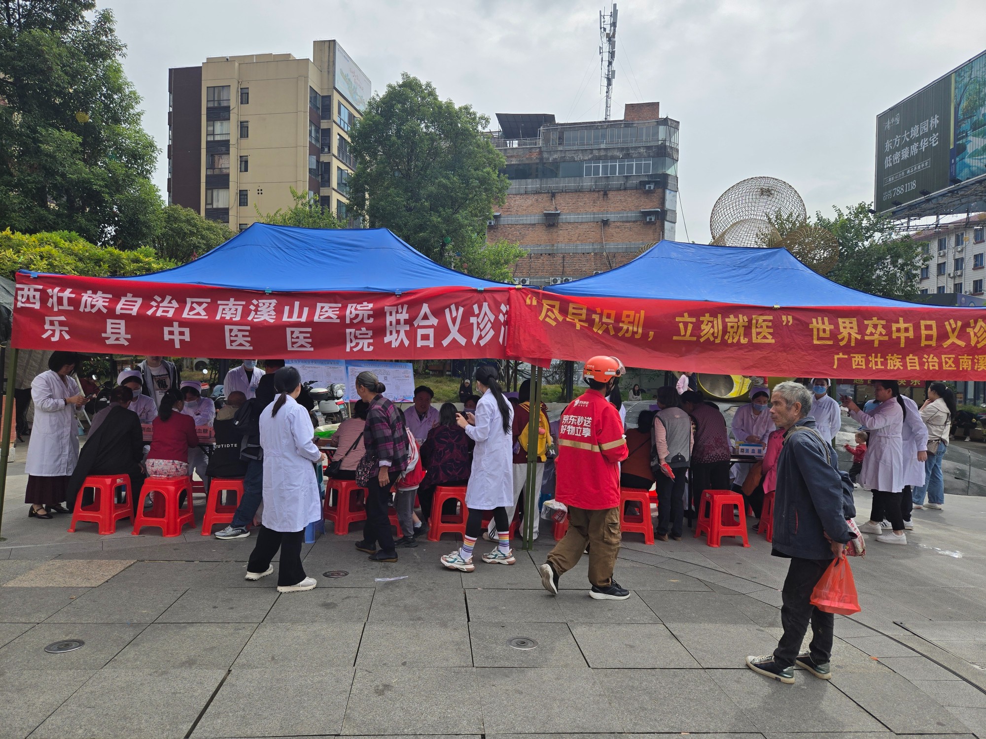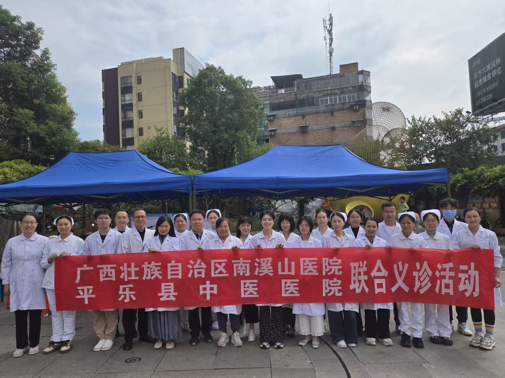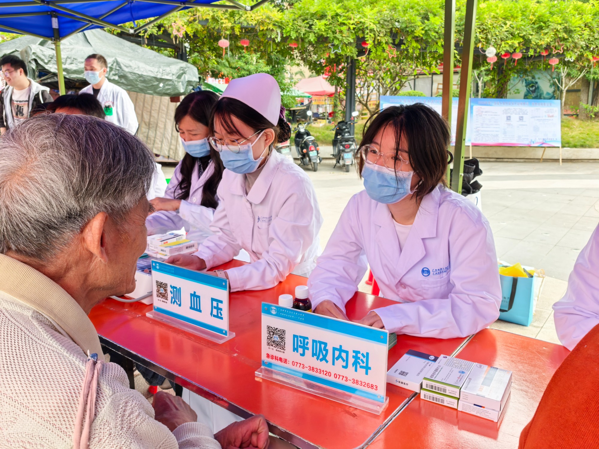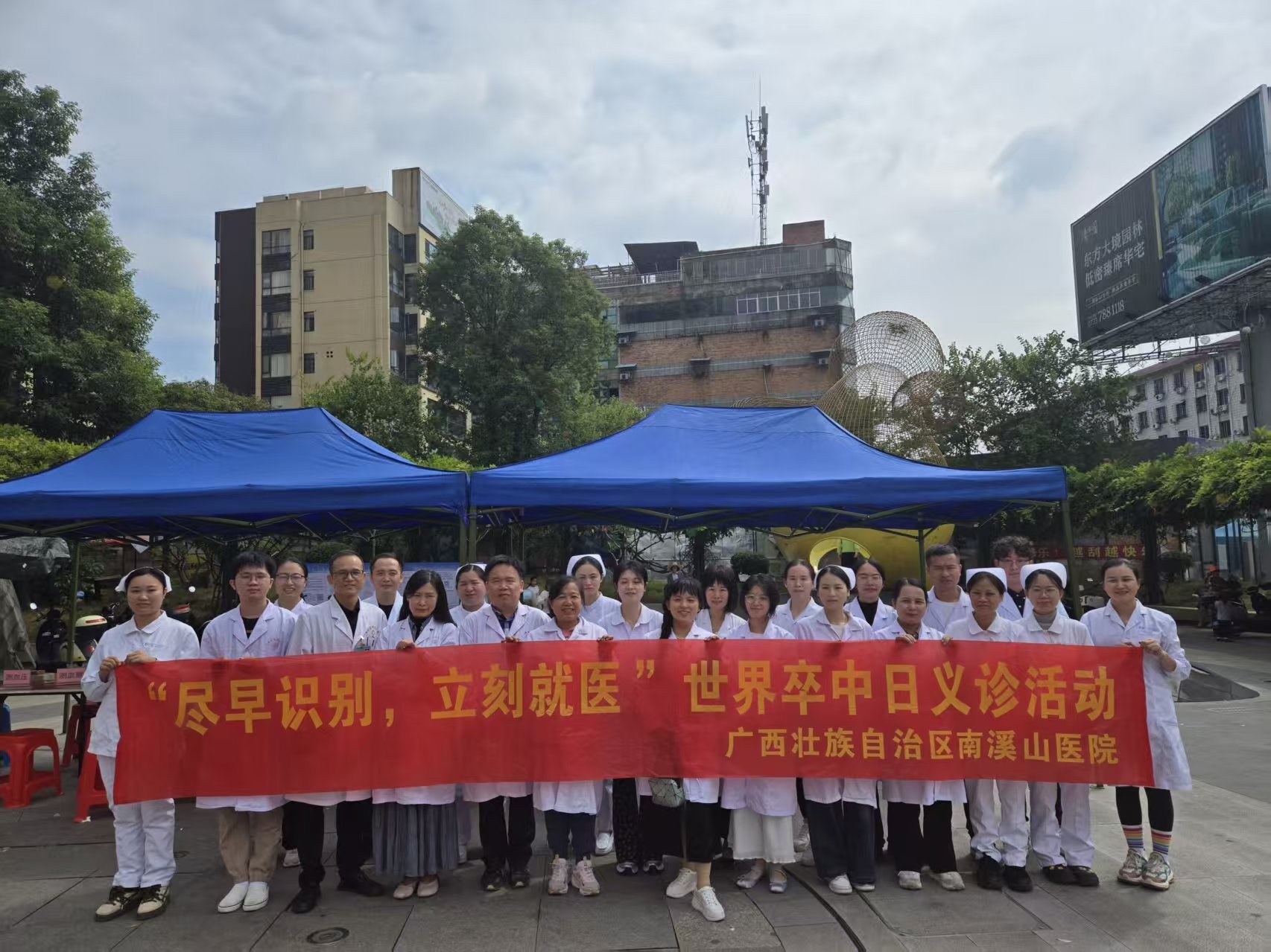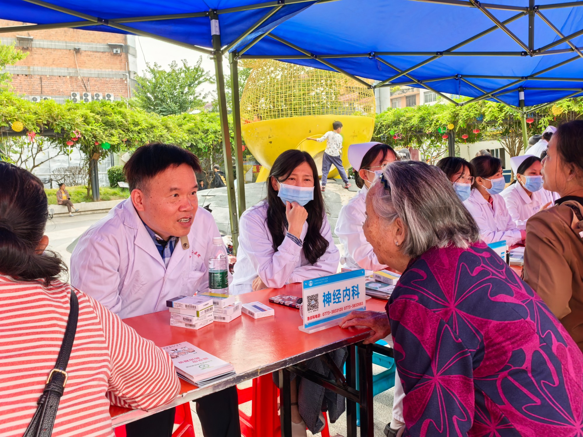 为积极响应2025年世界卒中日“尽早识别,立即就医”的宣传主题,广西壮族自治区南溪山医院神经内科联合呼吸与危重症医学科专家团队,与平乐县中医院脑病科携手于平乐县中心广场共同开展了一场以卒中防治为核心的大型联合义诊活动。此次活动通过资源下沉、服务延伸,将专业医疗知识送到群众身边,切实提升了基层群众对脑卒中的认知与防治能力。