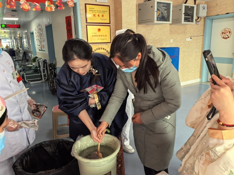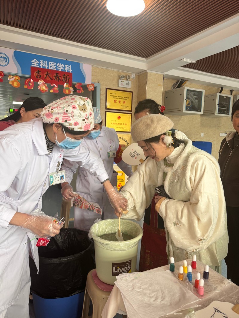 医护人员褪去白大褂,穿上美丽的汉服,化身“艺术导师”,与患者一同挑选颜料、设计纹样。漆液滴入清水,色彩随波晕染,扇面轻轻一转,便定格出独一无二的斑斓画卷。一位参与活动的患者王阿姨感慨:“平时住院总觉得时间漫长,今天和医生护士一起做手工,说说笑笑,感觉心里敞亮了许多!”