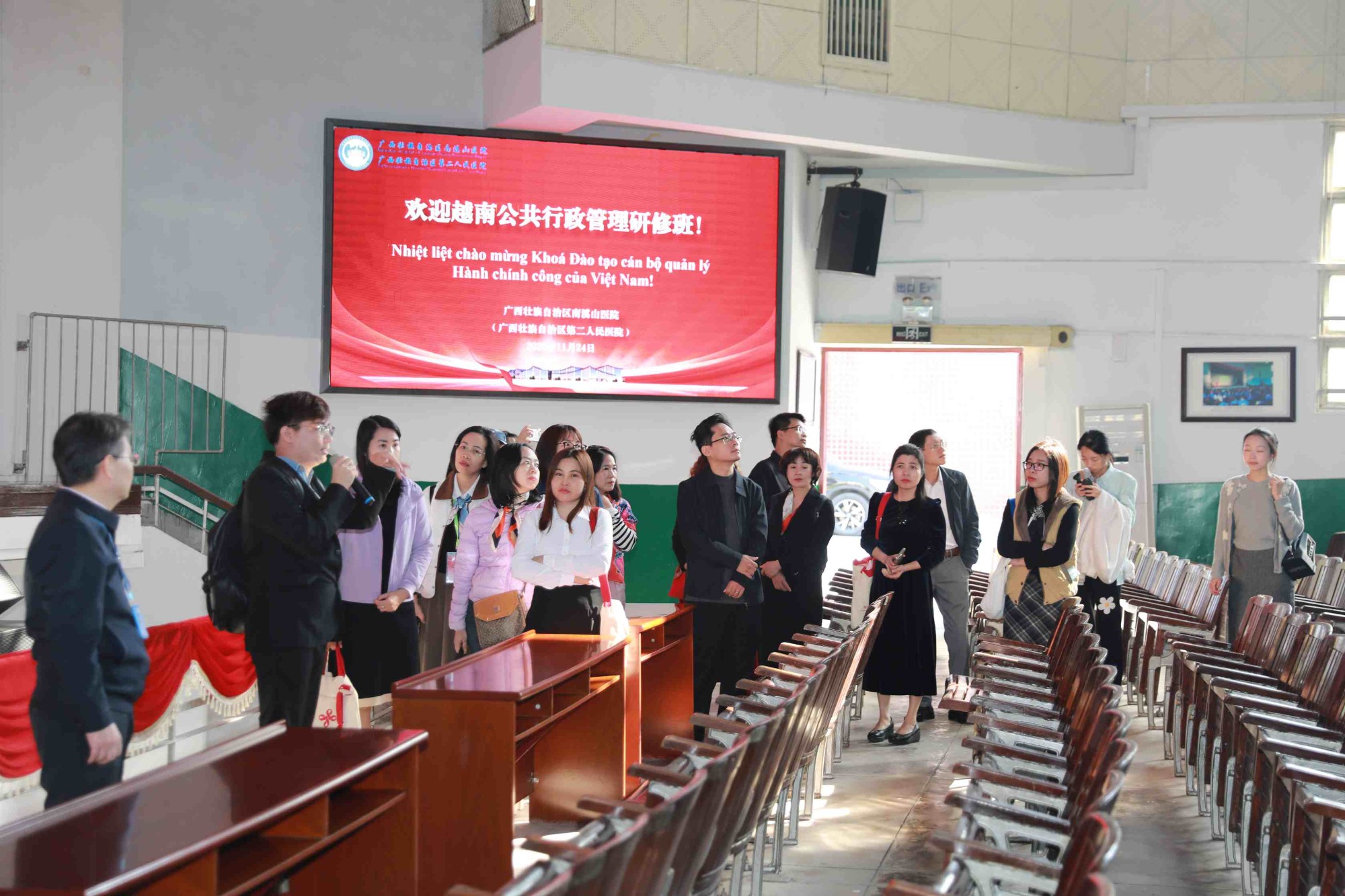 11月24日,由商务部主办、商务部国际商务官员研修学院承办的越南公共行政管理研修班代表团一行25人,到广西壮族自治区南溪山医院进行参观考察。