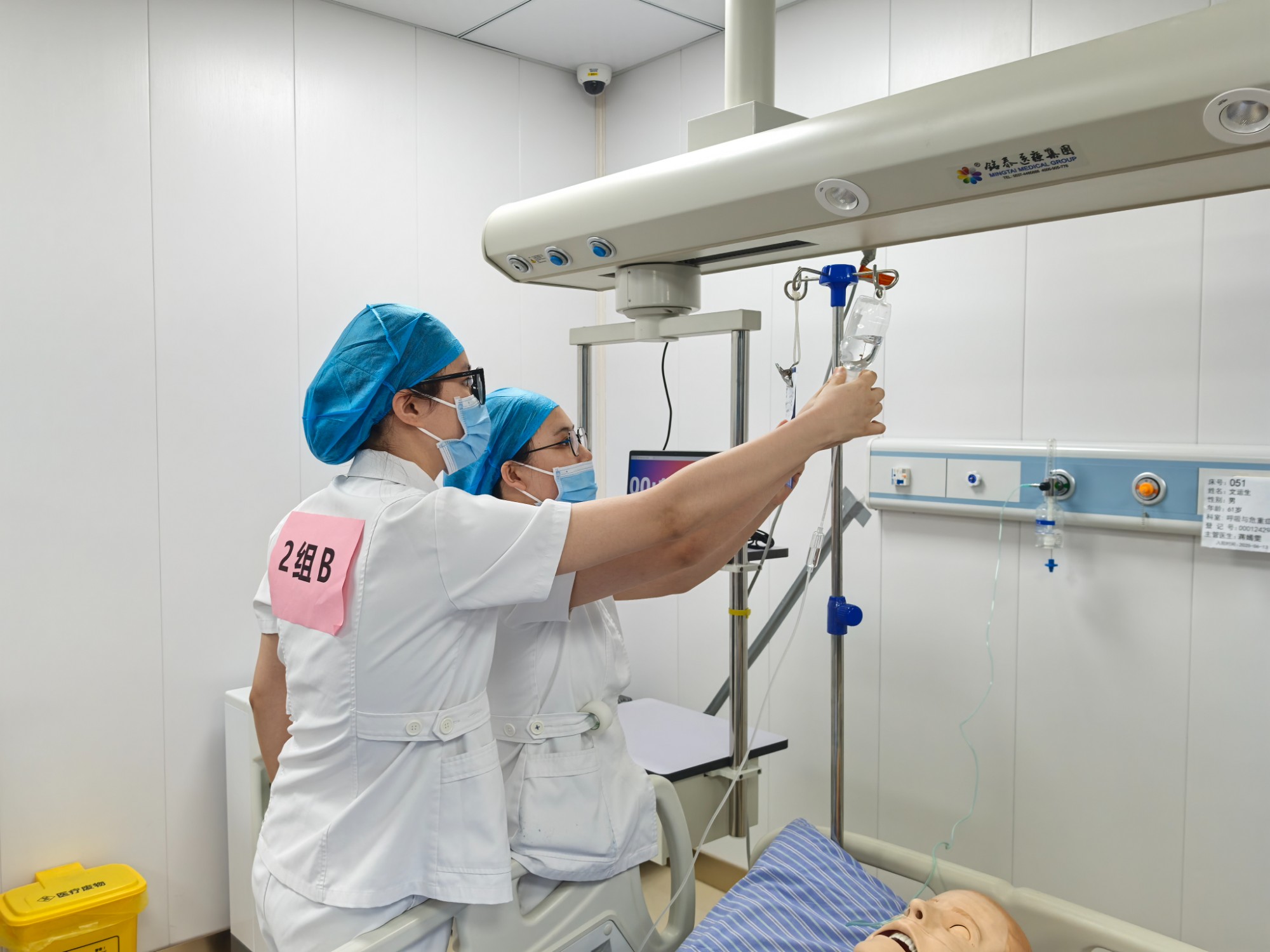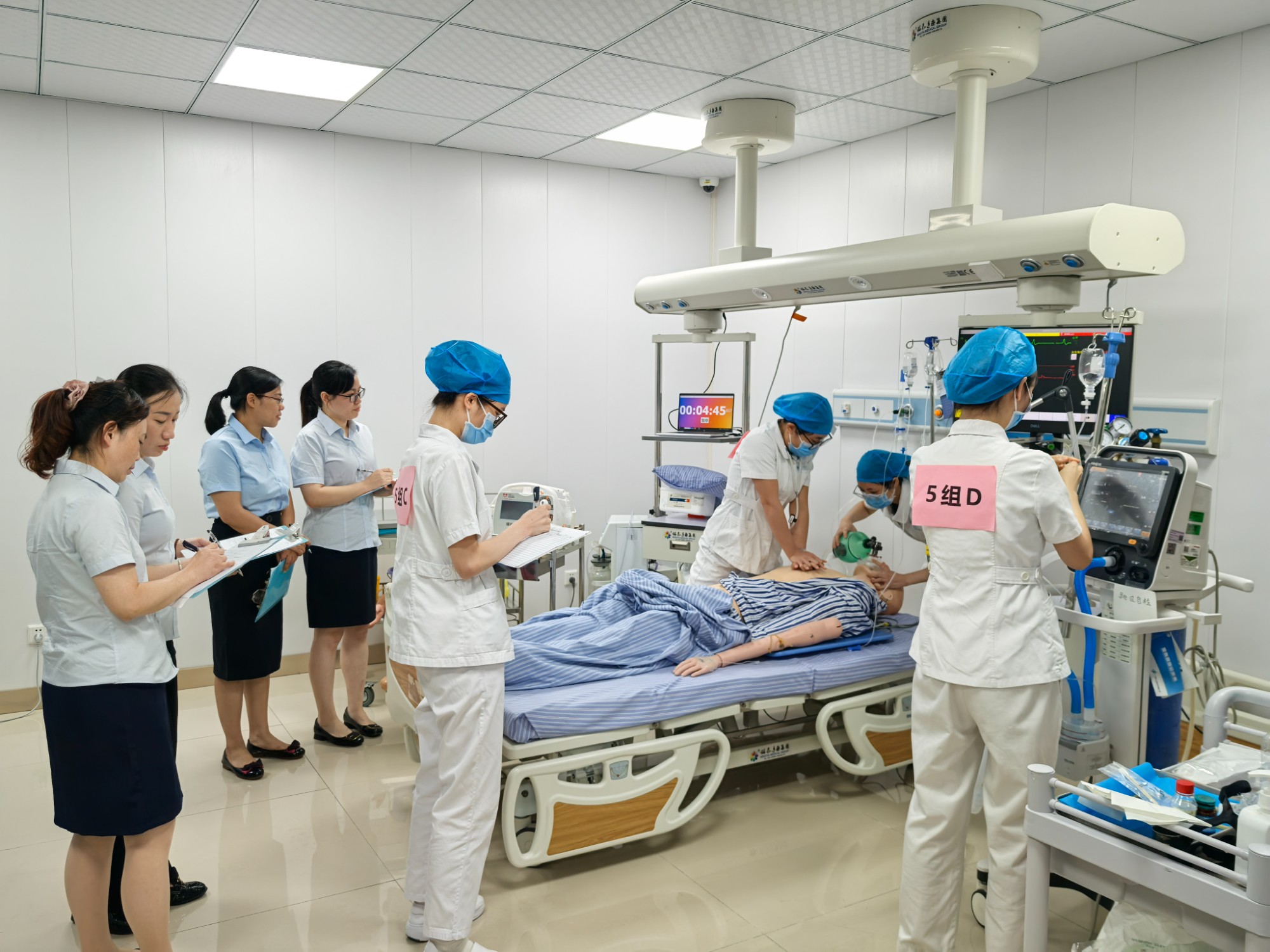 竞赛创新设置 "线上理论考核 + 情景技能操作" 双环节。理论考核通过护理助手平台随机抽题,覆盖常见重症疾病知识、临床应急处置、法律法规等内容;技能考核以临床案例为背景,设置心肺复苏、呼吸机使用等核心操作,同步融入心电异常波形识别等情景障碍,重点考察选手应急思维与团队协作。由重症领域资深护士长组成的评委团采用双评分制,确保赛事公平公正。