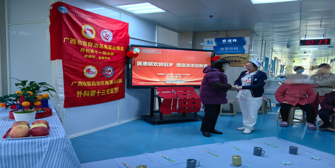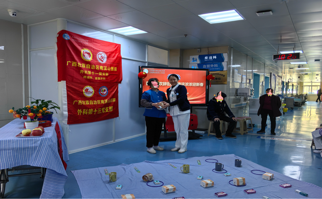 祥龙飞腾辞旧岁,金蛇舞动迎新春,为丰富医患精神文化生活,营造欢乐祥和的节日氛围,为弘扬传统文化,传递人文关怀,增添新年的氛围,让患者感受到节日的欢乐气氛,减轻患者压力,并促进身心健康。1月26日下午,南溪山医院外科第十一党支部与外科第十三党支部共同精心策划举办了一场迎新春系列庆祝活动。