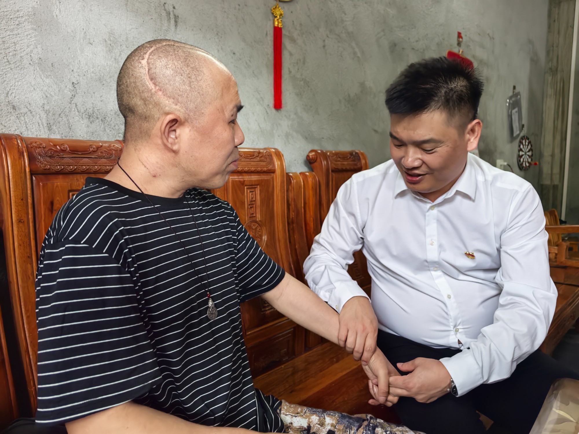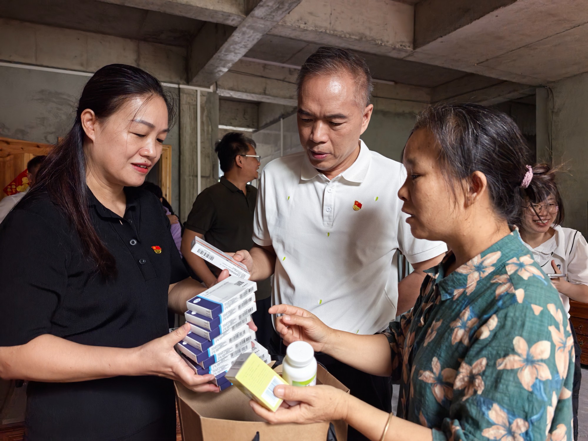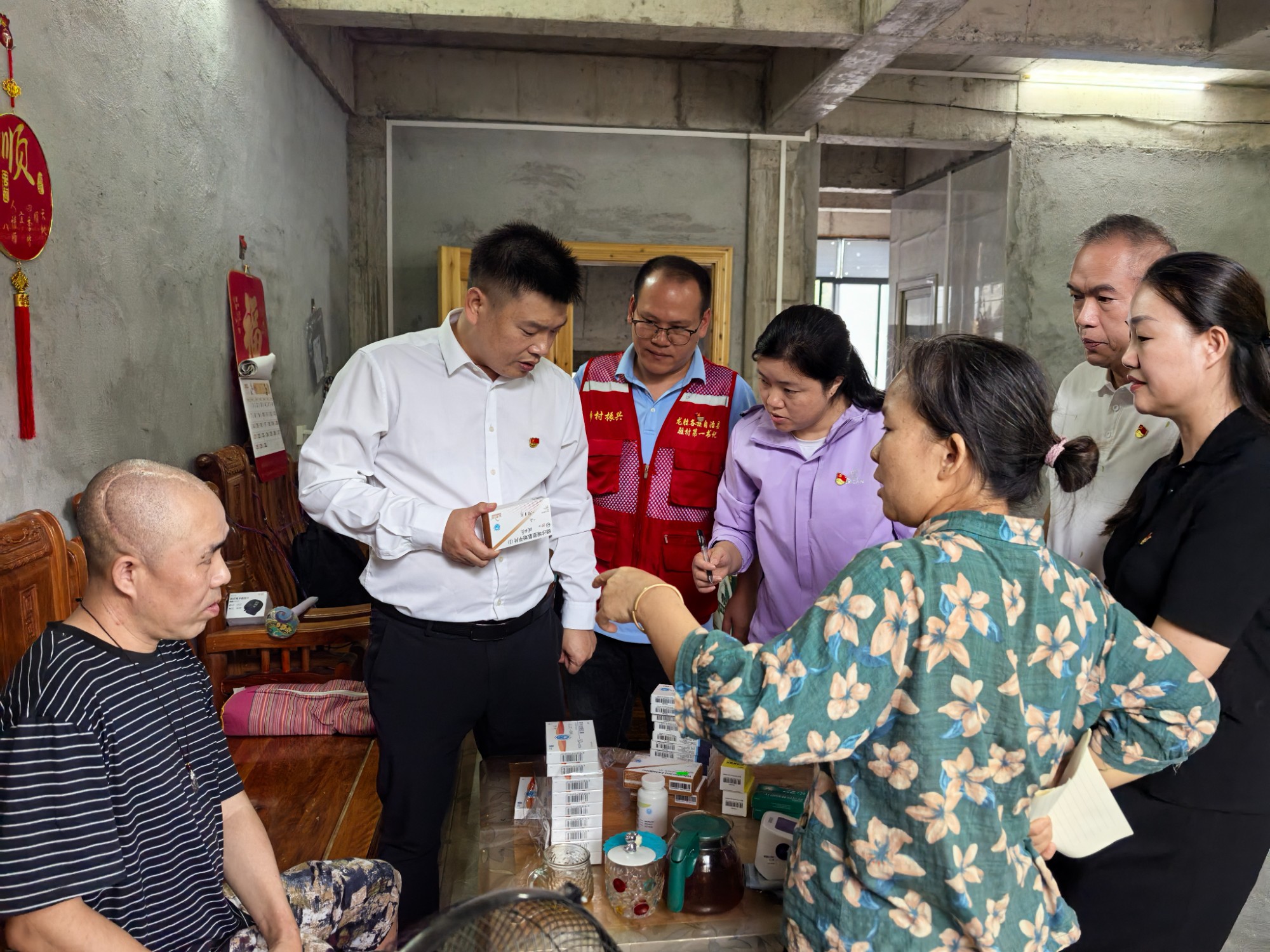 活动中,自治区卫生健康委项目资金监管服务中心党支部以及南溪山医院行政后勤第七、内科第十九党支部一行上门走访慰问了帮扶脱贫户,不仅耐心询问了他们的生产生活情况以及存在困难,还送去了中秋慰问品和节日祝福,并现场为他们检查身体状况,针对病情为他们准备了后期治疗的药品。