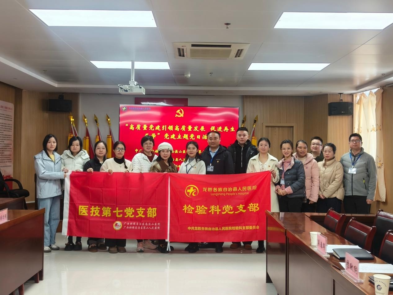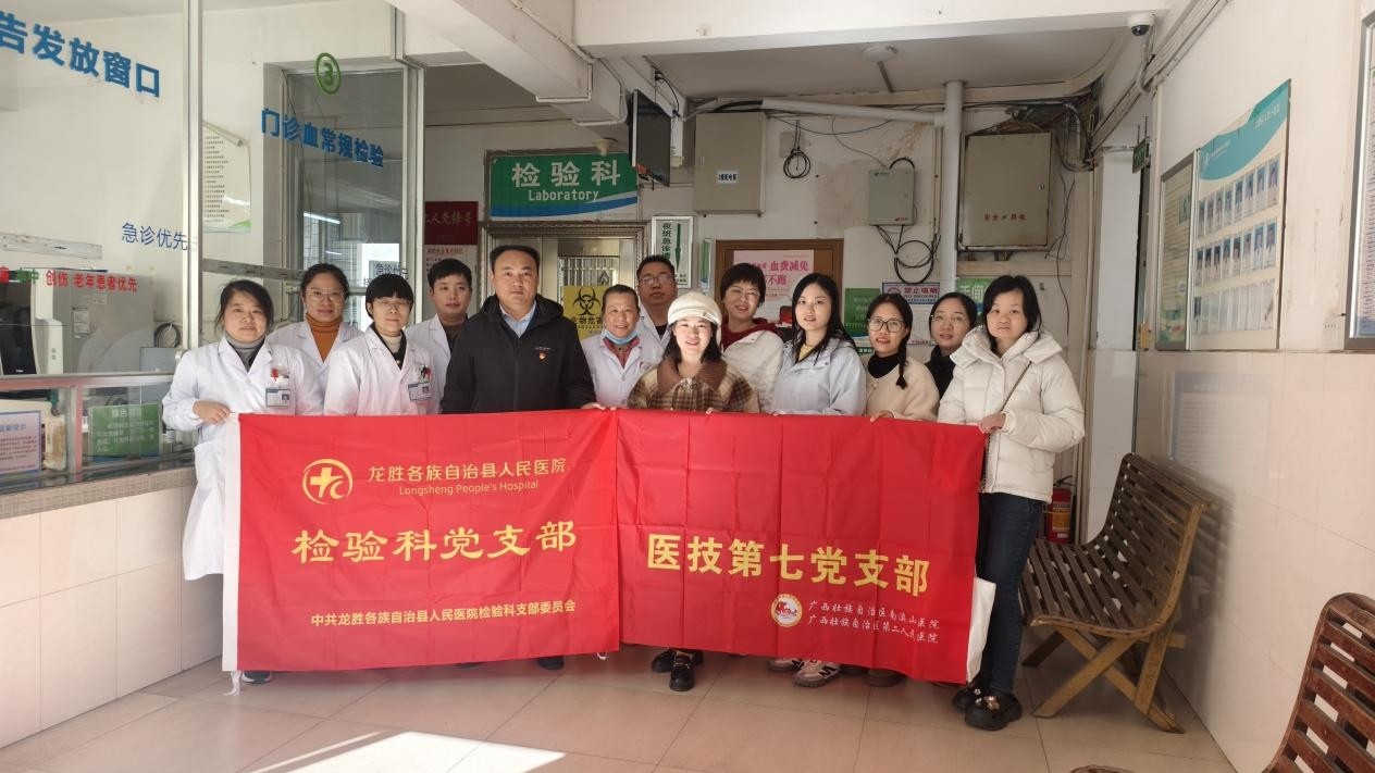 11月28日上午,自治区南溪山医院医技第七党支部的党员及入党积极分子赴龙胜县人民医院,开展“党建引领高质量发展, 党旗促进再生医学开花”主题党日活动。
