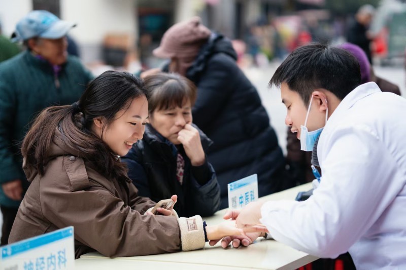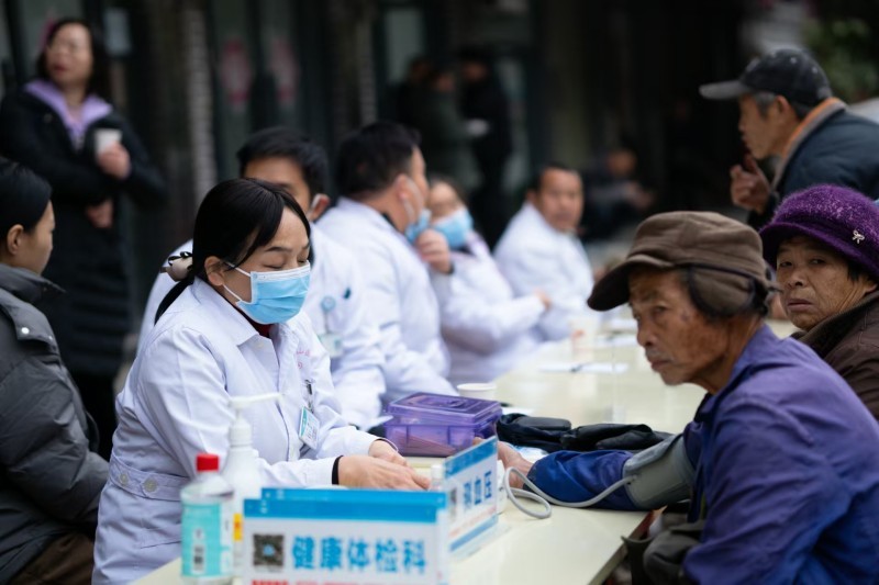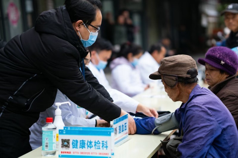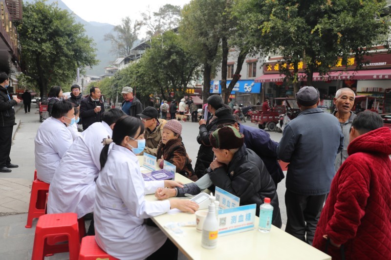 国际健康管理中心健康管理师赵慧为当地居民测量血压