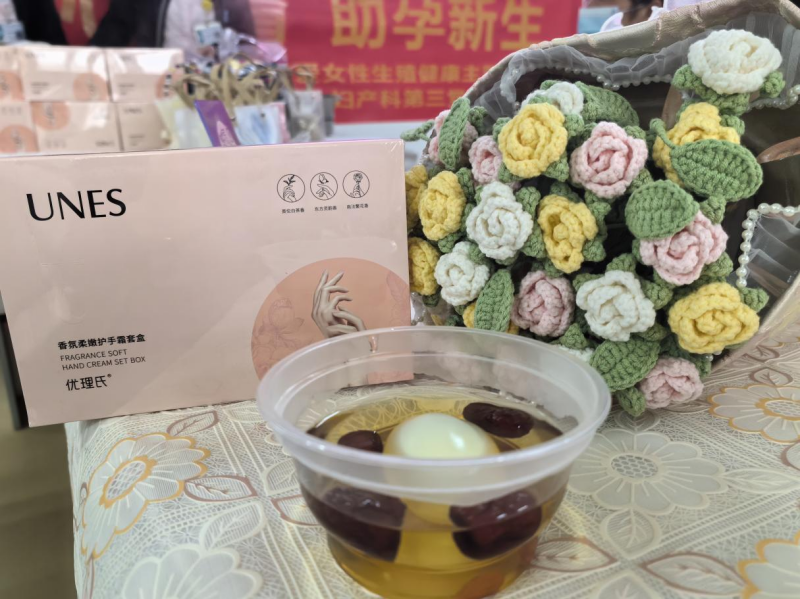 活动场地精心布置了以“悉心培育、助孕新生”为主题的背景墙,墙上点缀着鲜花和祝福语,营造出温暖而充满希望的氛围。每位到场的女性朋友都收到了一盒护手霜和一碗“枣生贵子汤”,寓意着对她们双手辛勤付出的感谢以及祝愿女性朋友们早生贵子。