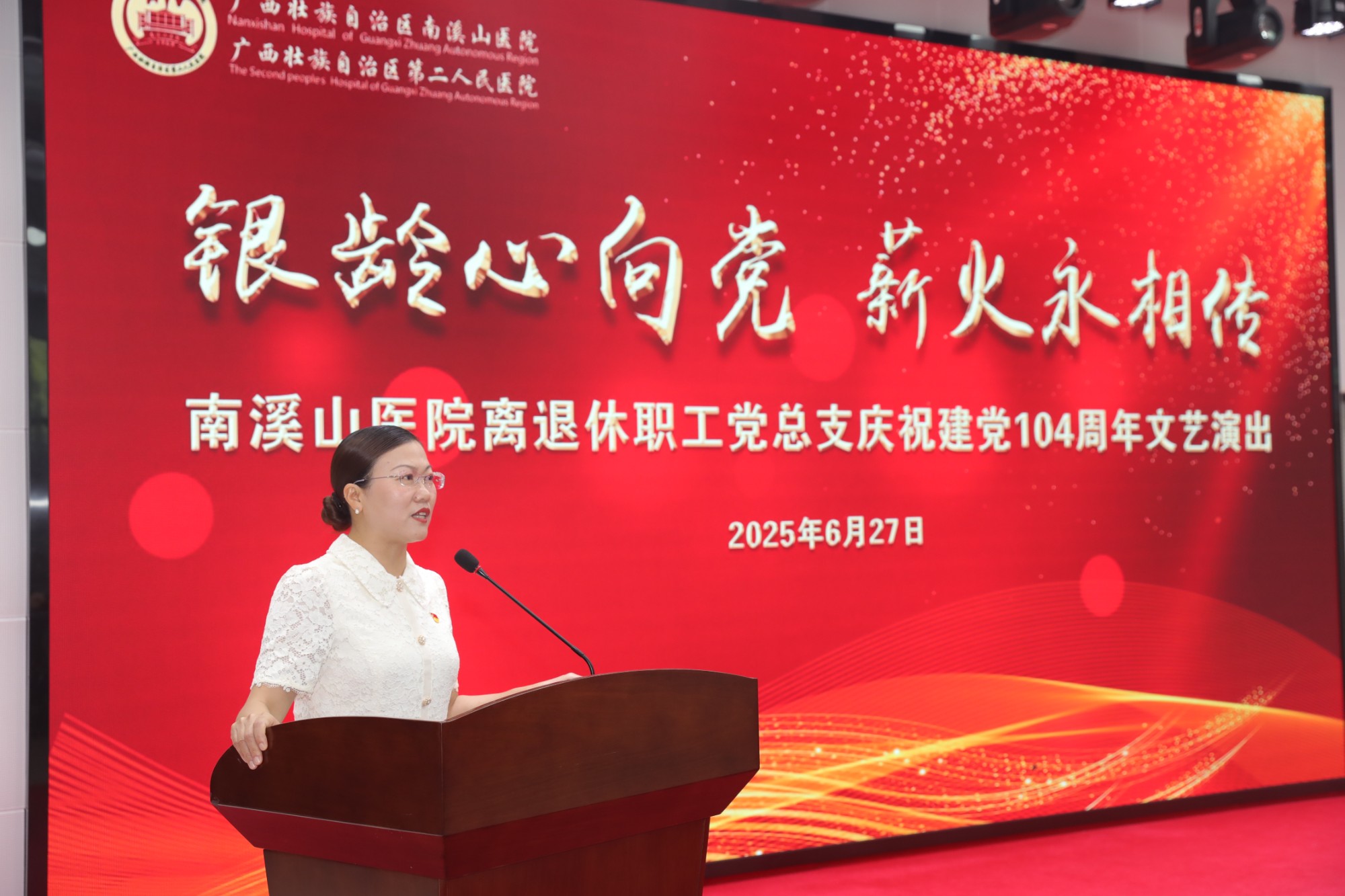 6月27日,医院离退休职工党总支在科研楼学术报告厅举行“庆祝建党104周年党员大会暨文艺演出”。活动现场,唐芬副院长带领老党员们面对鲜红党旗,高举右拳重温入党誓词,铿锵誓言回荡全场,彰显着党员们对党的赤诚与担当。随后,唐芬副院长发表讲话,回顾党的百年征程与辉煌成就,结合医院发展实际汇报成绩:“医院今日的进步,凝结着一代代老党员的智慧与汗水,你们是最宝贵的精神财富。”她勉励全体党员传承红色基因,为医院高质量发展再立新功。