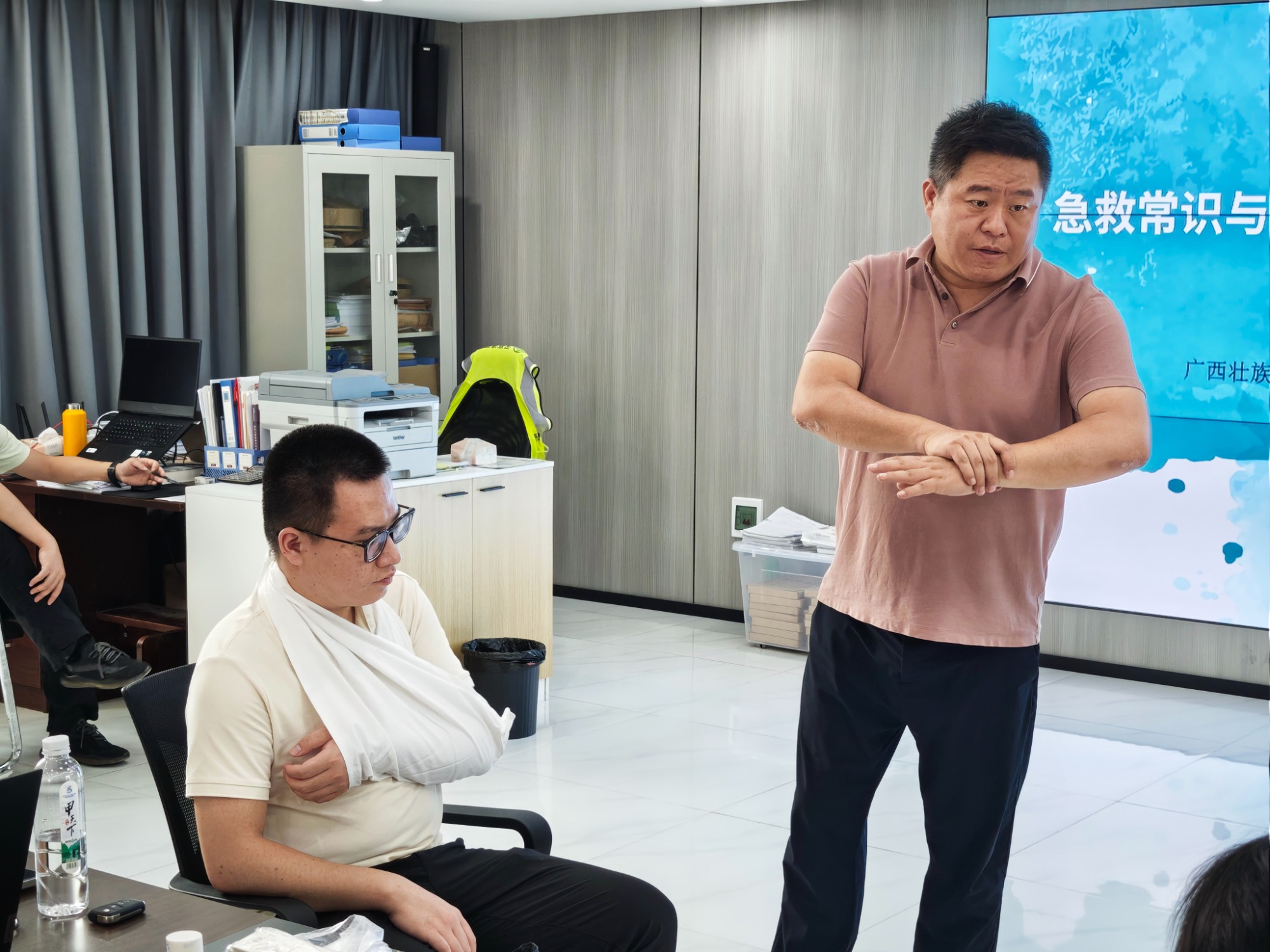 活动现场,急诊科主任王松结合真实案例与图文资料,系统讲解了中暑的诱因、症状分级及危害,强调“高温环境下需定时补水补电解质、避免长时间暴晒、合理安排工间休息”等核心预防原则。针对企业职工常见的外伤风险,王松主任现场演示了止血、包扎等急救操作规范,护士团队则通过互动教学,指导职工正确使用冰敷袋、降温喷雾等应急用品,让理论知识转化为可上手的实操技能。