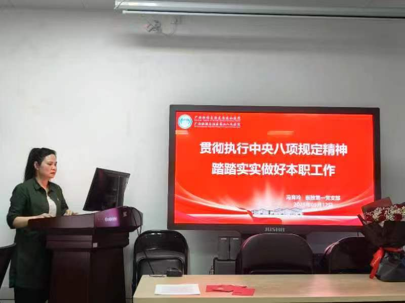 最后,冯育玲结合科室实际,以《贯彻执行中央八项规定精神,踏踏实实做好本职工作》为题,给全体党员和护理同仁上了一堂党课。