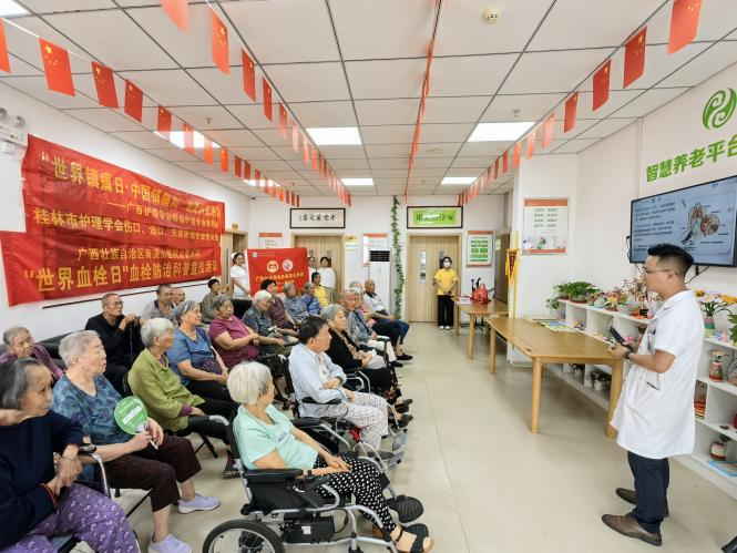 科室医护人员主动走进社区和养老机构,将专业的血栓防治服务送至居民身边。在养老机构,团队成员结合日常生活场景,生动讲解长期卧床、久坐出行等情况下如何有效预防血栓,现场示范踝泵运动、腿部拉伸等简单易行的动作。大家认真听讲、踊跃提问,纷纷表示在家门口就能享受到三甲医院的专业服务,不仅方便了就医咨询,更学到了实用的防病知识,真正把健康握在了自己手中。