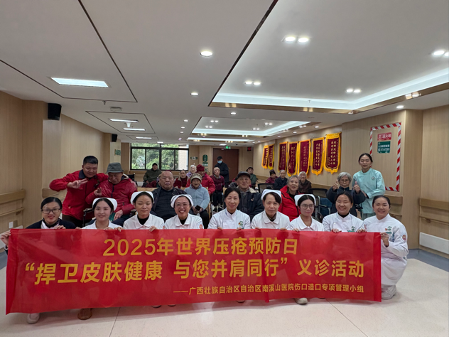 在2025年世界压疮预防日到来之际,广西壮族自治区南溪山医院伤口造口专项管理小组于11月20日前往桂林夕阳红养老中心,开展以“捍卫皮肤健康,与您并肩同行”为主题的专业义诊与学术指导活动。本次活动将健康知识宣教、专业技能指导与床旁精准治疗相结合,为养老院的老年群体及护理团队带来了前沿、实用的压疮预防与管理方案。