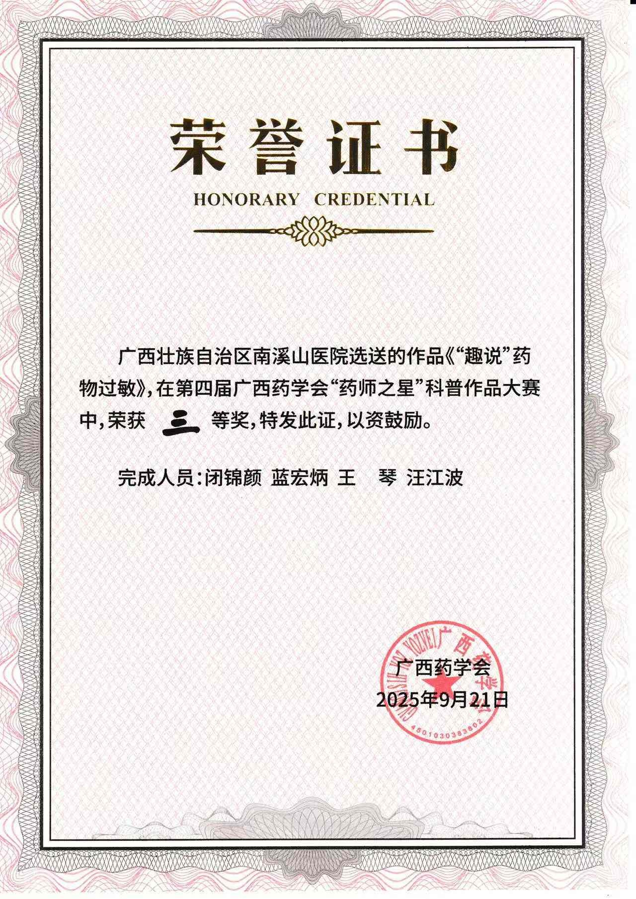 为普及科学知识,提升药学工作者用药健康科普教育能力,9月18日,由广西药学会主办的第四届“药师之星”科普作品大赛决赛在广西梧州举行。自治区南溪山医院药学部参赛作品《趣说药物过敏》进入决赛,并在决赛中表现优异获得三等奖的好成绩。