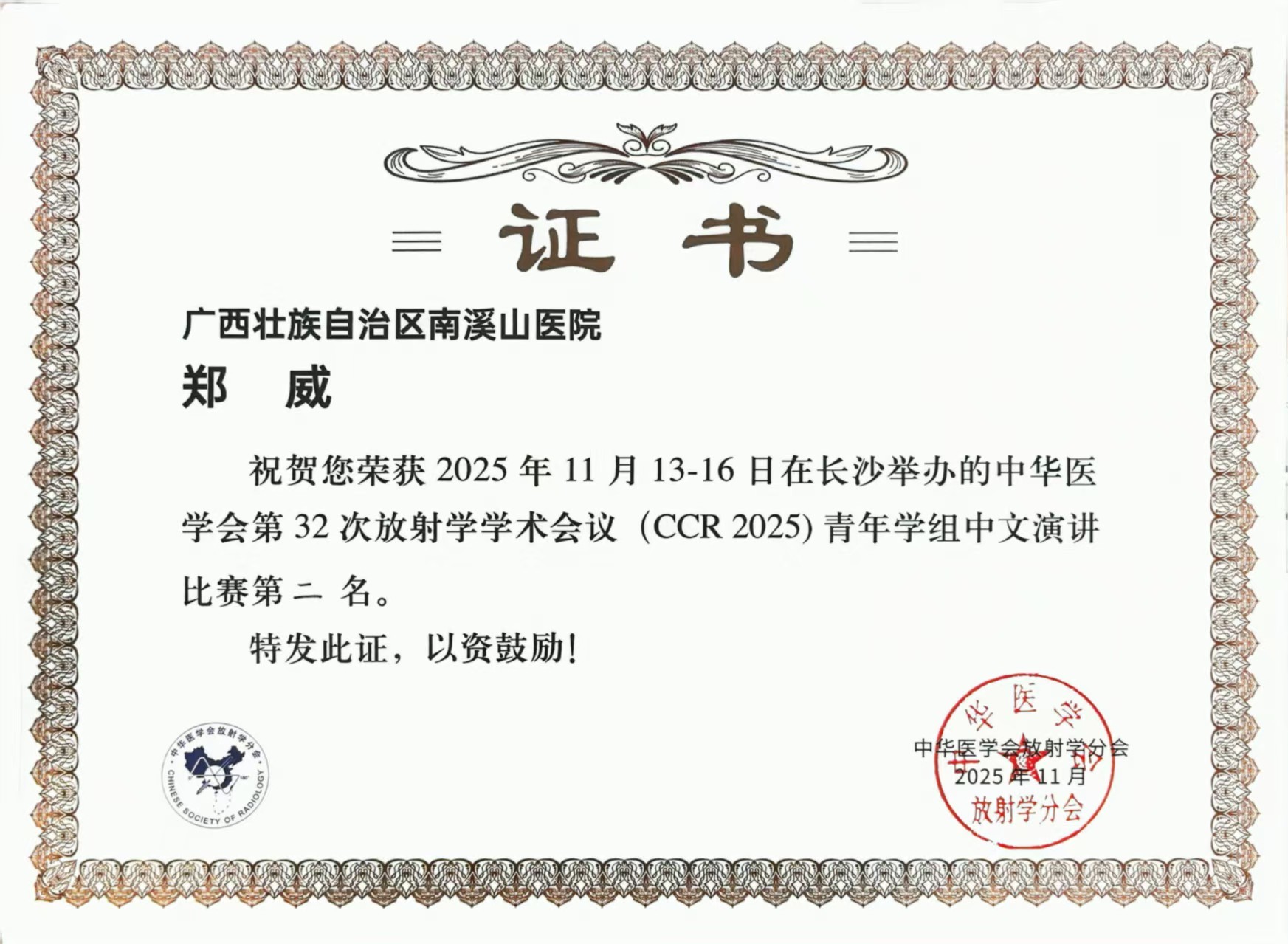 尤为值得一提的是,青年医师郑威的论文在众多投稿中脱颖而出,成功入围竞争最为激烈的“青年学组中文演讲比赛”决赛。该赛事是CCR为发掘和培养放射学青年人才所设的高水平平台,入围即代表其学术质量获得权威认可。决赛中,郑威医师凭借创新的研究内容、扎实的专业功底与出色的现场表现,在与全国顶尖医院青年代表的激烈角逐中,最终荣获第二名(二等奖)的优异成绩。