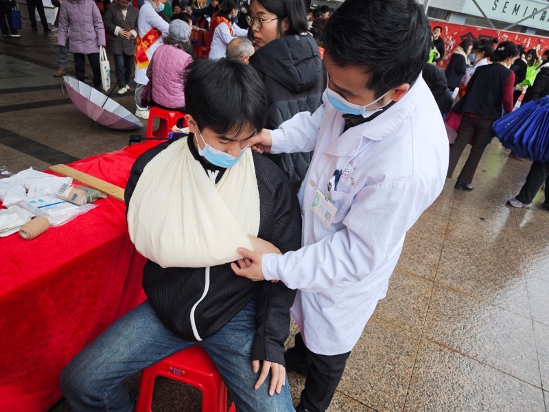 自治区南溪山医院急诊科(广西青年文明号)青年团队来到桂林市万福广场,快速布置场地后就开始了当天的急救科普志愿服务活动,医护人员通过“讲解+实操”的方式,手把手指导市民学习处理心脏骤停、气道异物梗阻、外伤出血等常见急救场景,并通过模型实操掌握徒手心肺复苏急救法、海姆立克法、外伤止血包扎等急救技能。