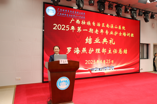 4月25日,自治区南溪山医院在学术厅举行“2025年第一期院内老年专业护士培训班”结业典礼,仪式由老年医学科护士长罗春妮主持,护理部主任罗海燕对培训班的工作进行了全面总结,并对下一步老年护理工作进行了部署。老年医学科主任李贵宇、护理部副主任黄锦芳、张健坤、全体授课老师及学员参加了结业仪式。