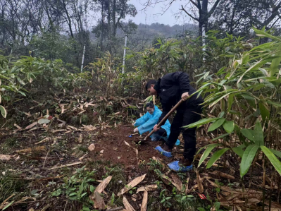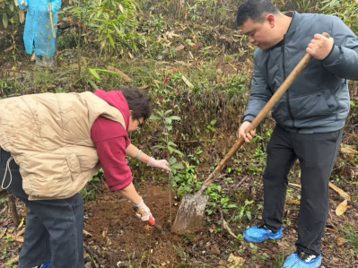 活动伊始,团支部书记蒋久文组织团队成员分工合作,大家各司其职,有的主动承担起搬运树苗的重任,一趟趟穿梭在泥泞之中,小心翼翼地将树苗护送至指定位置;有的紧握铁锹,用力挥锹挖坑,一铲一铲,将希望的坑穴精心挖就;有的专注于扶正树苗并填土夯实,每一个动作都认真细致,力求让树苗稳稳扎根。雨水不断打湿衣襟,可这丝毫未能削减大家的热情,现场一派热火朝天的劳动景象。