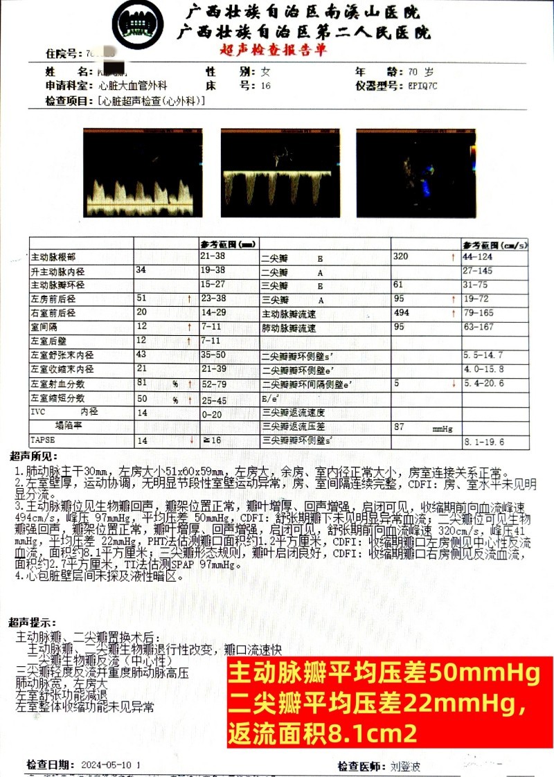 患者70岁女性,身高158cm,体征39kg,2017年在南溪山医院行主动脉瓣、二尖瓣双生物瓣膜置换术,术后未规律随访,并自行停用相关药物,2024年2月开始出现活动后气促,平地行走20米即感不适,于2024年5月入院,超声心动图检查提示:主动脉瓣、二尖瓣人工瓣膜均出现功能障碍。