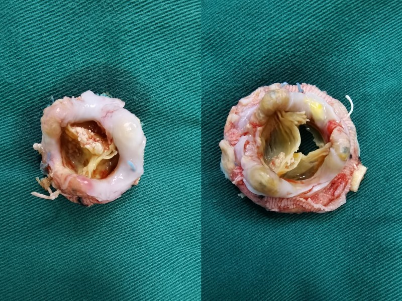 此次手术过程顺利,切除原生物二尖瓣、主动脉瓣耗费时间较多,但植入新的生物瓣膜时使用免缝合瓣膜完成,大大缩短了手术时间。术后当晚患者已拔除气管插管,第1天即可下地活动,超声复查显示置换的免缝合主动脉瓣生物瓣膜功能正常,术后3周出院。