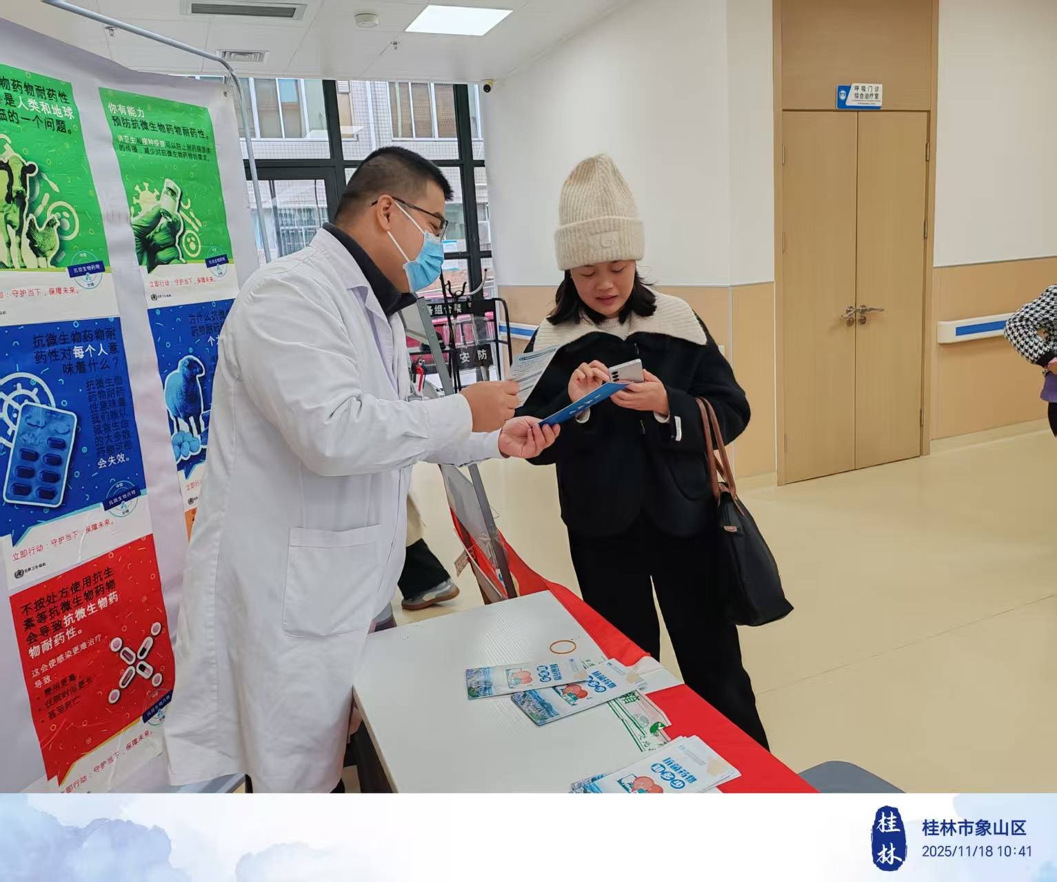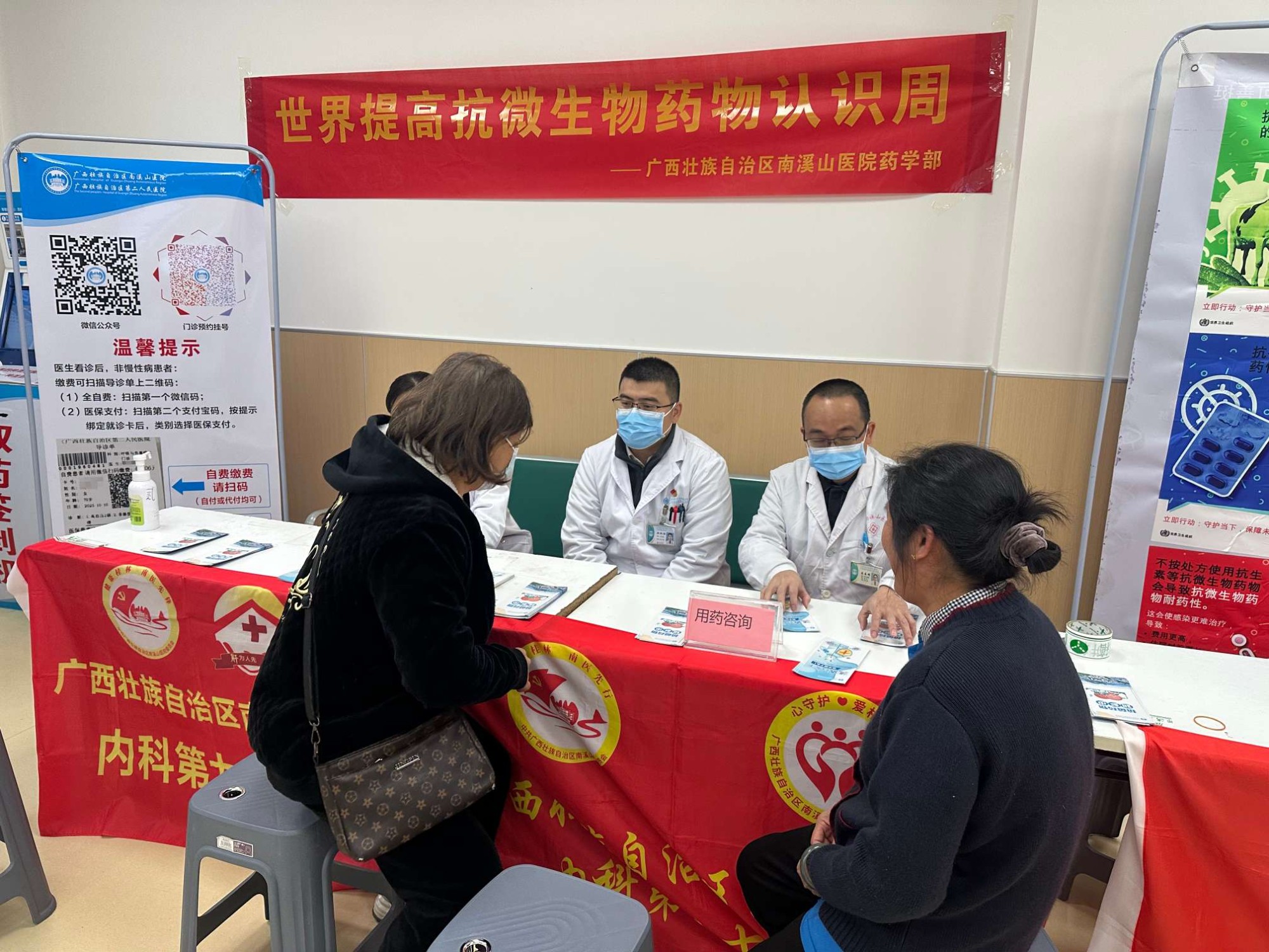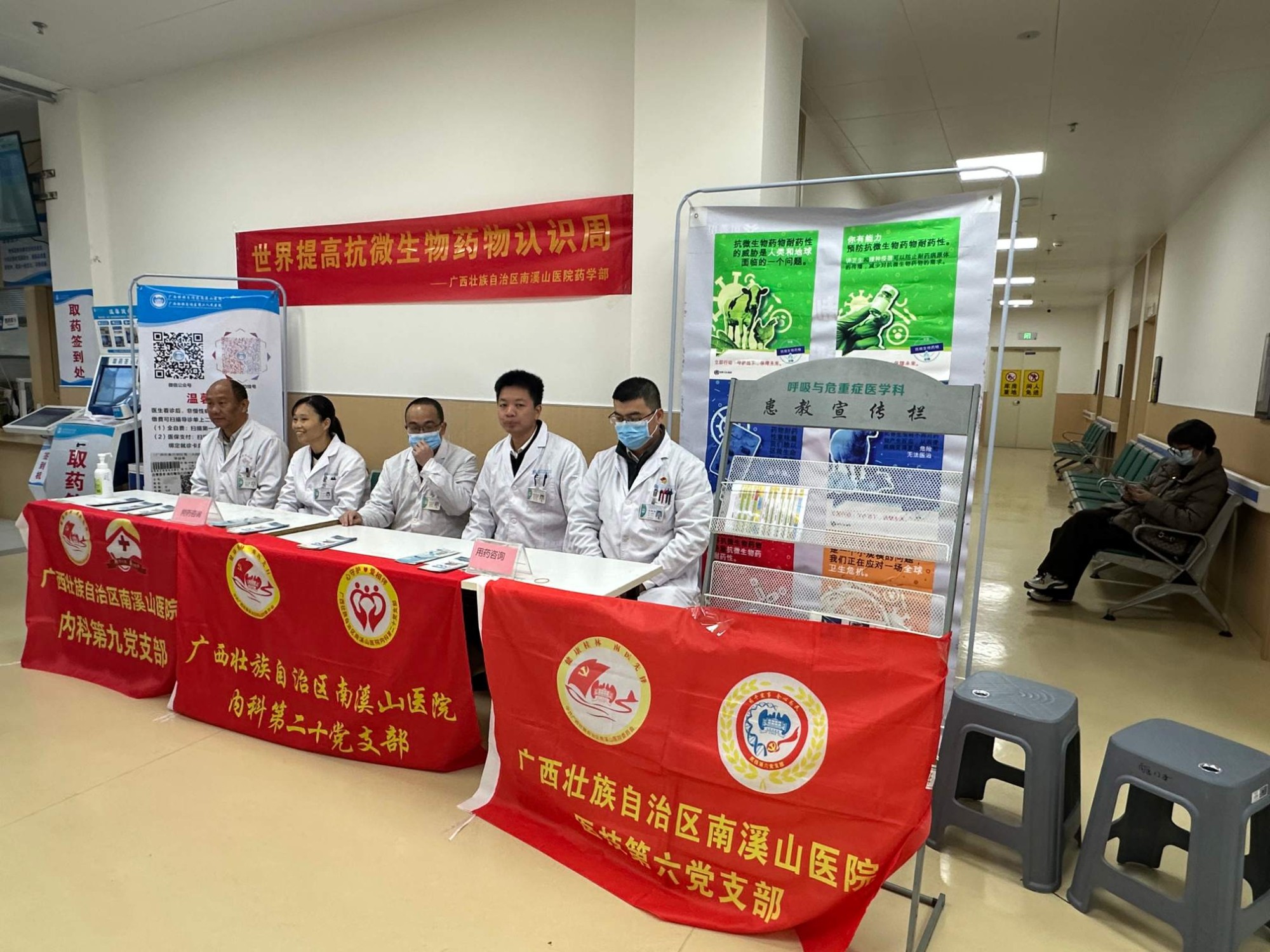 每年11月的第三周是“世界提高抗菌药物认识周”。为积极应对细菌耐药带来的挑战,提升抗菌药物合理使用水平,11月18日上午,广西壮族自治区南溪山医院医技第六党支部(药学部)联合内科第九党支部(感染性疾病科)与内科第二十党支部(安宁疗护中心),在新门诊楼大厅共同开展抗菌药物知识宣传及义诊活动。