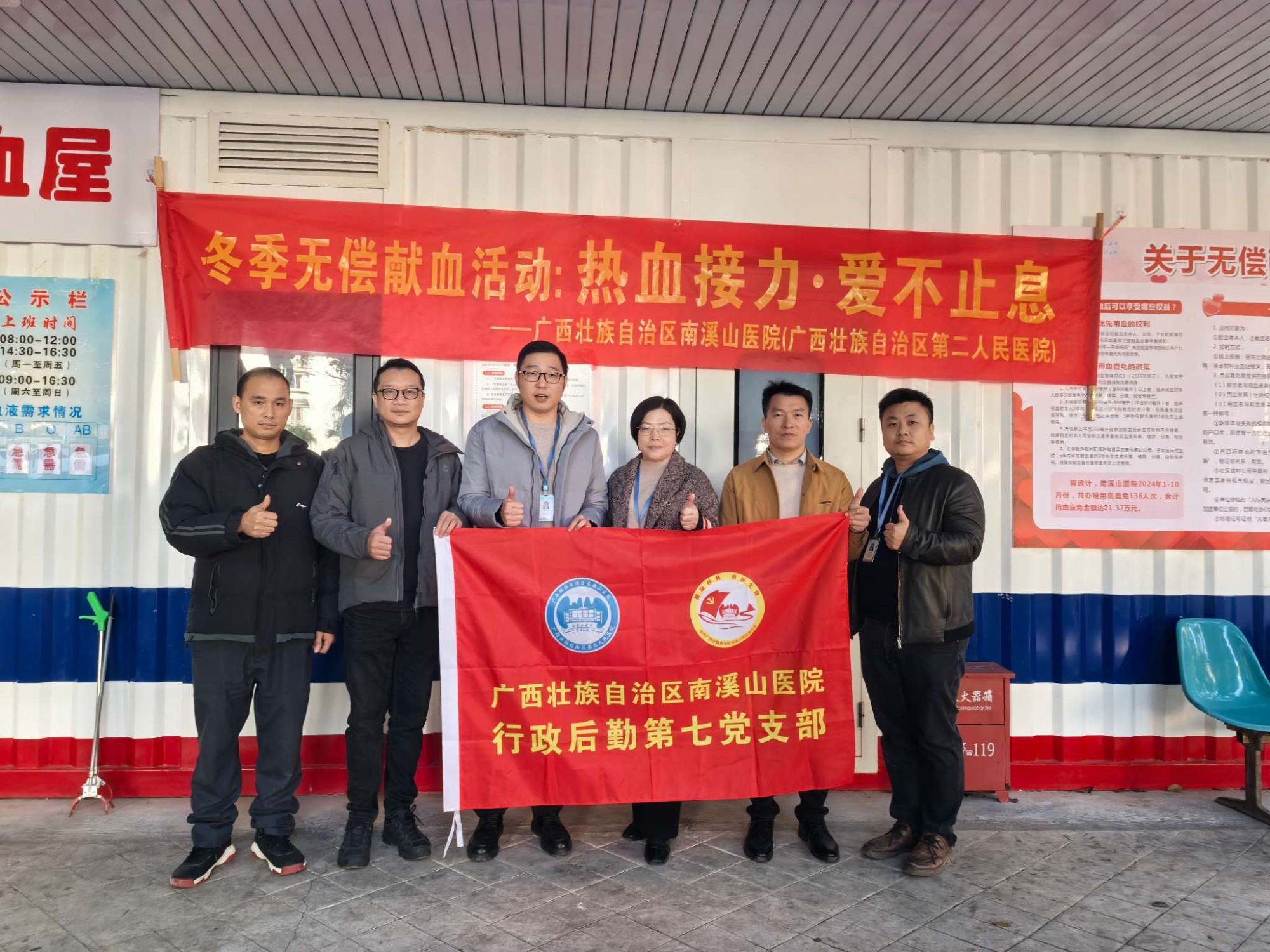 11月18日至19日,广西壮族自治区南溪山医院行政后勤第七党支部积极响应号召,通过党支部联动、宣传动员及合作单位共建等方式联合华保盛集团桂东北区域、门急诊建设项目部,组织开展冬季无偿献血活动,以实际行动践行“病友至上、生命至上”的服务宗旨。支部党员、积极分子积极报名参加,本次活动最终组织25人踊跃参与,用殷红热血为生命续航。