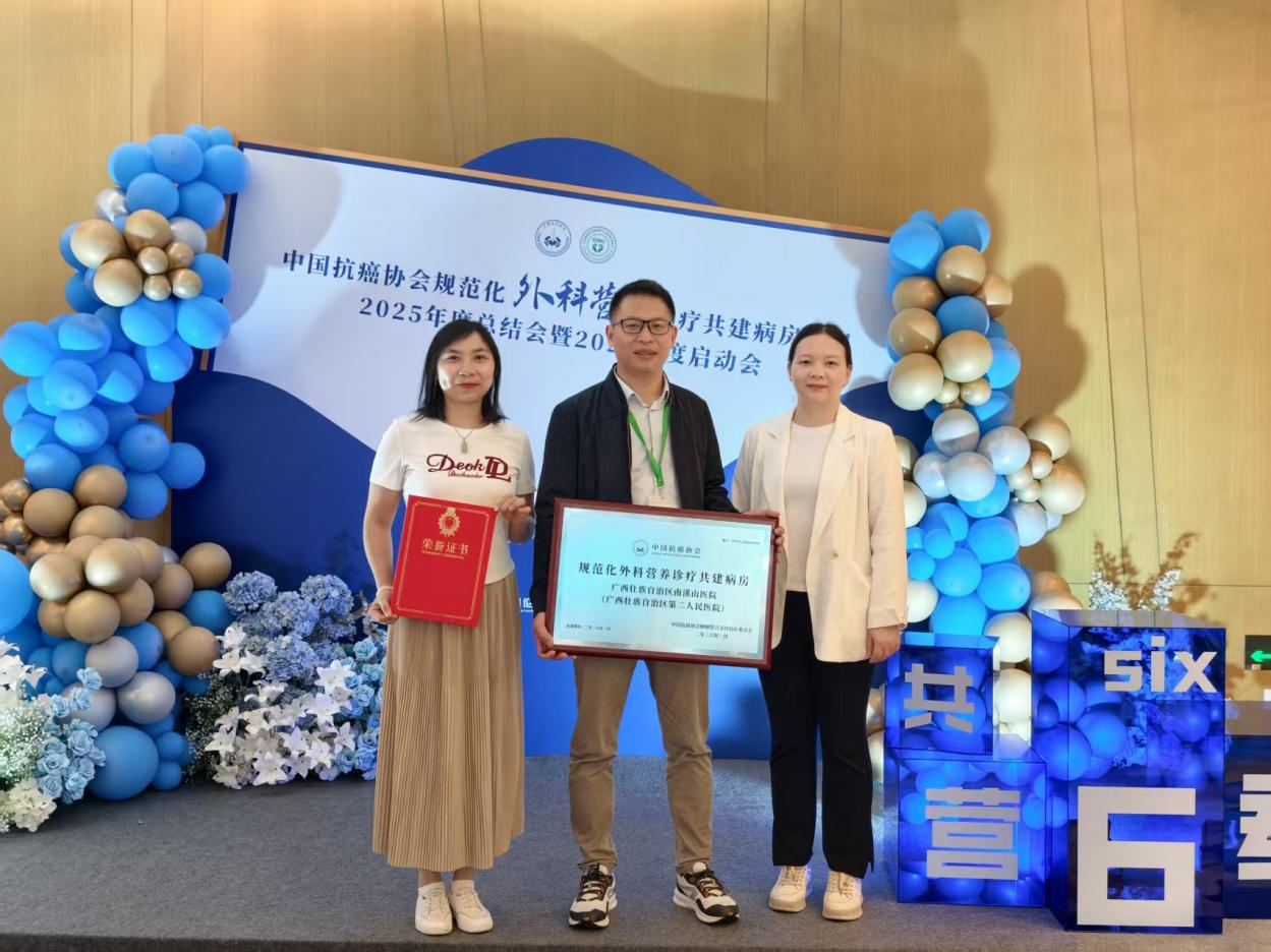 近日,广西壮族自治区南溪山医院胃肠肛管疝腹壁外科正式获授中国抗癌协会“规范化外科营养诊疗共建病房”称号。这一国家级认证的落地,标志着医院在外科营养诊疗规范化建设、肿瘤患者围手术期营养支持领域,正式迈入全国先进梯队,为桂北及周边地区患者带来更专业、更全面的营养诊疗服务。