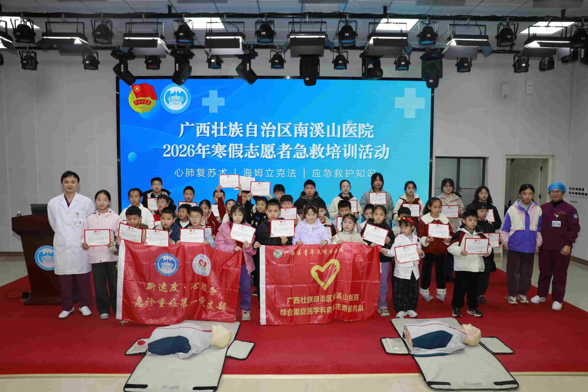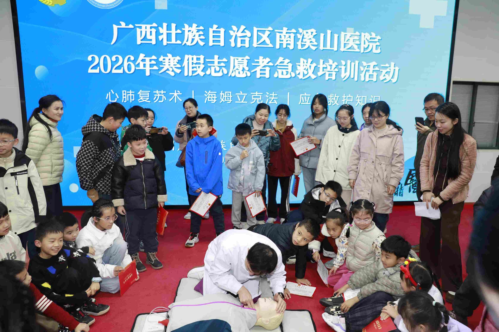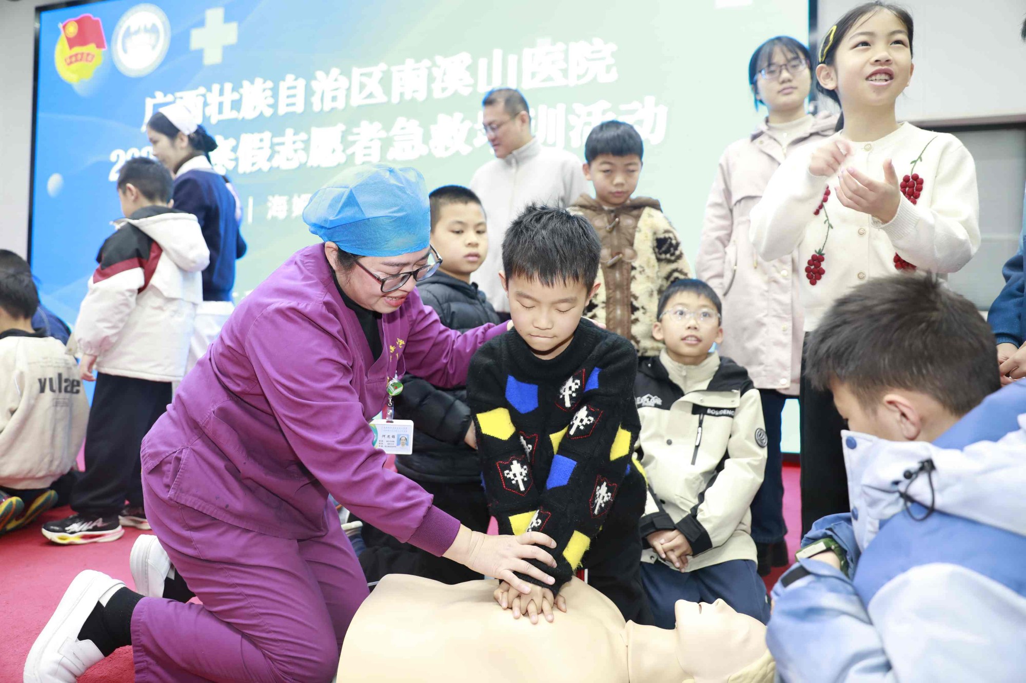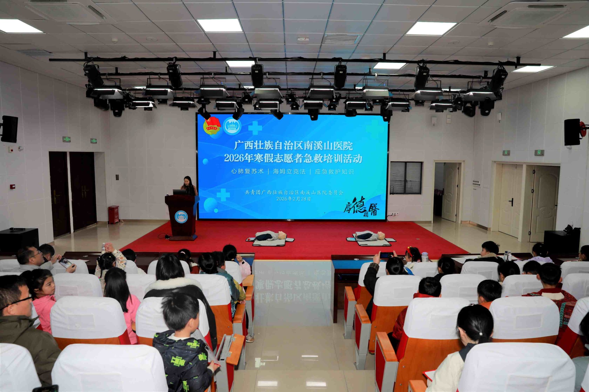 2026年2月28日上午,广西壮族自治区南溪山医院团委举办了寒假志愿者急救技能专题培训,本次培训有效融入了小学生社会实践活动。60余名小学生与大中学生志愿者共同参与,将社会实践与生命教育有机融合,让孩子们在“理论+实操”的沉浸式教学中学习徒手心肺复苏、海姆立克法等急救技能,在体验中学习急救知识,增强安全意识。
