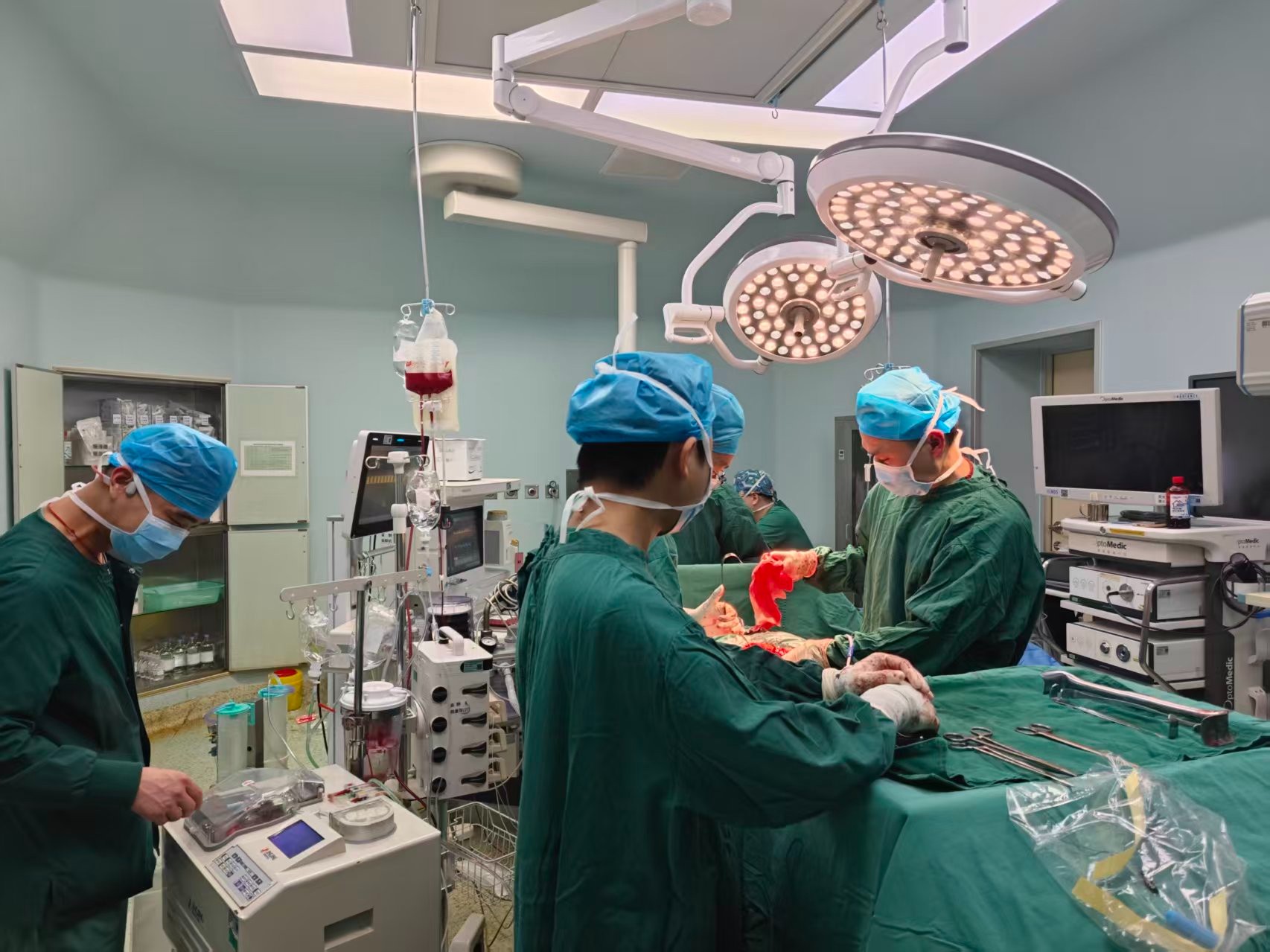 18时,手术争分夺秒开始。术中见患者腹膜后积血较多,右侧肾脏破裂严重,积血导致手术空间少,渗血多,手术视野差,操作难度大。麻醉团队迅速启动自体血回输系统,同步开展输液、输血、升压等一系列抢救措施,其中自体血回输量达1150ml,最大限度节约用血、保障患者循环稳定。手术团队在极度困难的条件下沉着应对、精准操作,果断为患者实施右侧肾切除术,彻底控制出血;同时,烧伤整形与创面修复外科团队为患者行面部裂伤修复缝合。