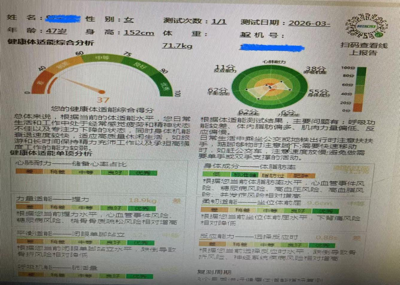 检测数据可在体检客户的手机小程序上随时随地查阅,为慢性病管理(高血压、糖尿病)提供运动干预依据。体适能检测对久坐的办公族可以评估因长期低头、久坐导致的肌肉失衡风险;对减肥/塑形人群可以精准分析体脂率与肌肉量,避免盲目节食;对运动爱好者可以筛查潜在的运动风险(如关节活动度不足),提升运动表现;另外对中老年人也可以测试平衡能力,预防跌倒,评估身体衰老程度等。健康管理中心的医务人员尤其是党员干部定当全心全意努力为广大人民群众的健康保驾护航!
